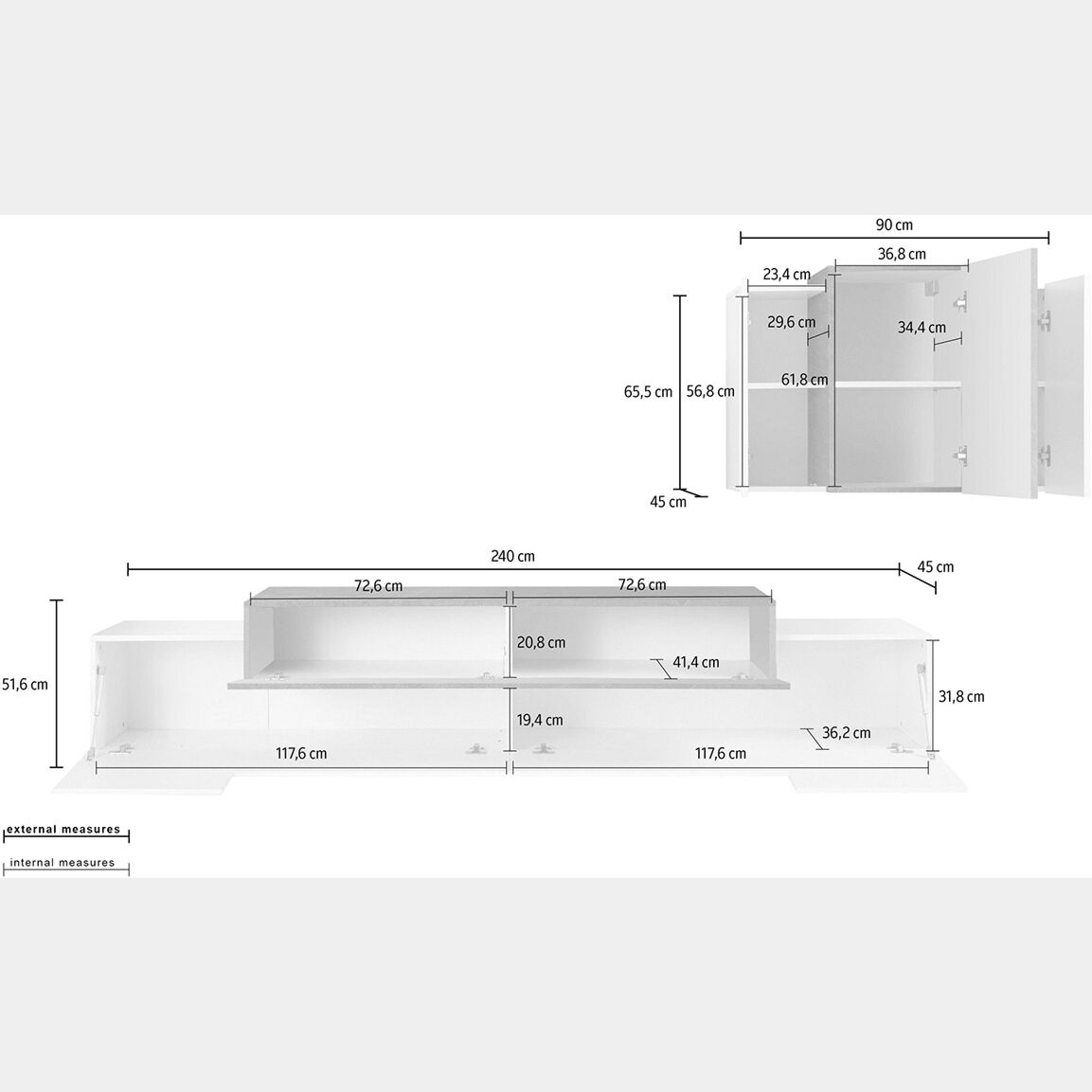 Il porta tv presenta 3 ribalte: quelle inferiori sono in finitura Bianco lucido mentre la superiore in Cemento, quest'ultima è dotata di un ripiano centrale.