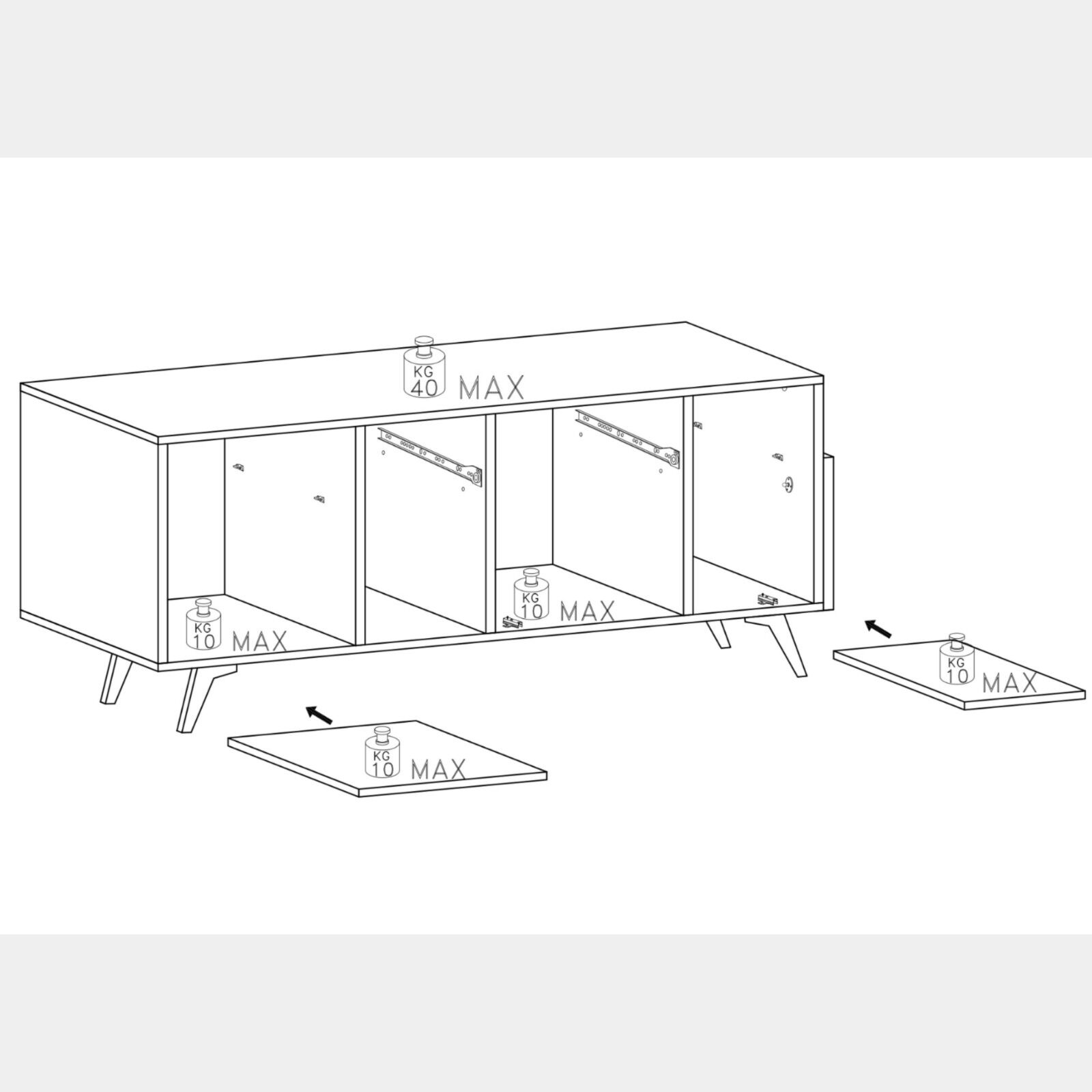 Il mobile tv presenta sulla sinistra un'anta con ripiano centrale, un cassetto, una ribalta sulla destra e due vani a giorno. La suddivisione dello spazio assicura un'ampia capienza per tutti gli oggetti utilizzati con la tv, libri e soprammobili.