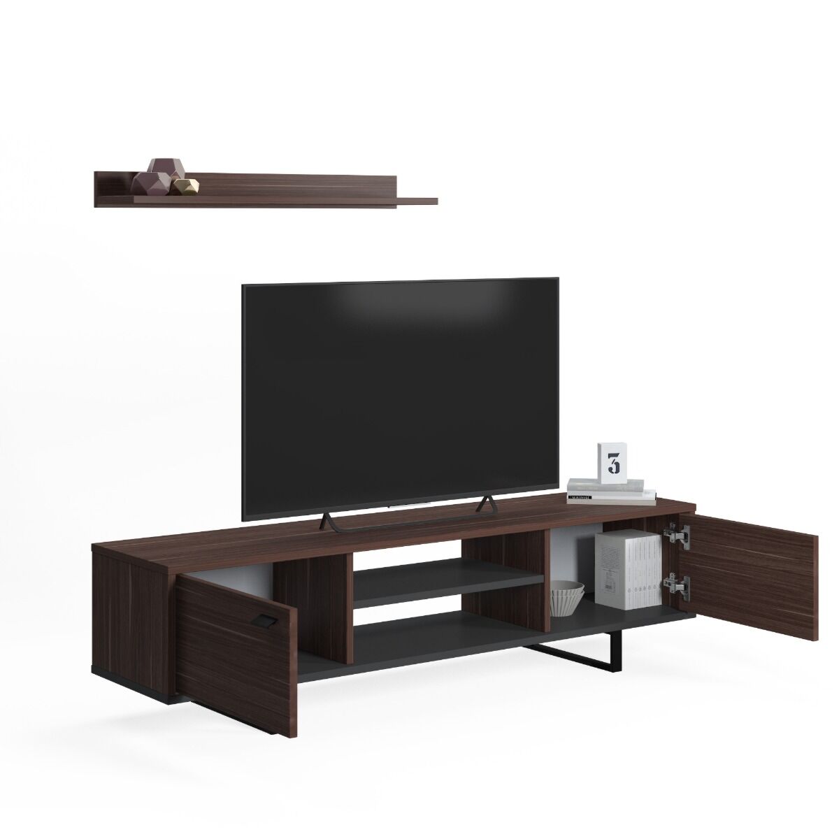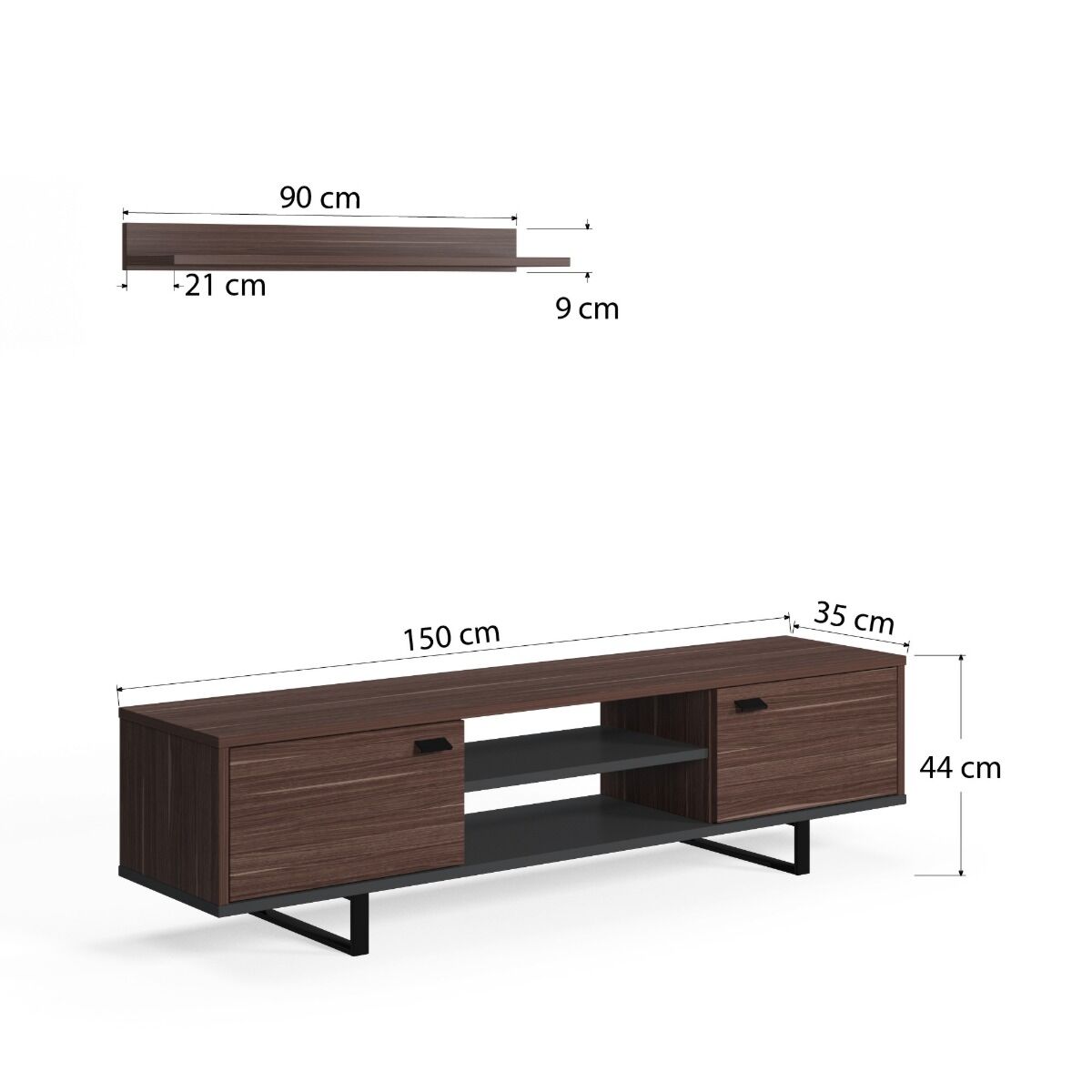 Il porta tv è dotato di 2 ante noce con maniglia rettangolare antracite che richiama la finitura del ripiano centrale e delle gambe. In dotazione viene inoltre fornita la mensola noce di L.90 cm.