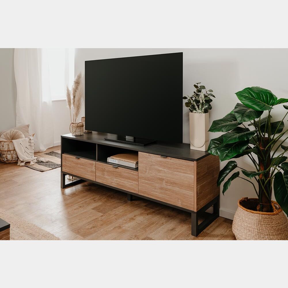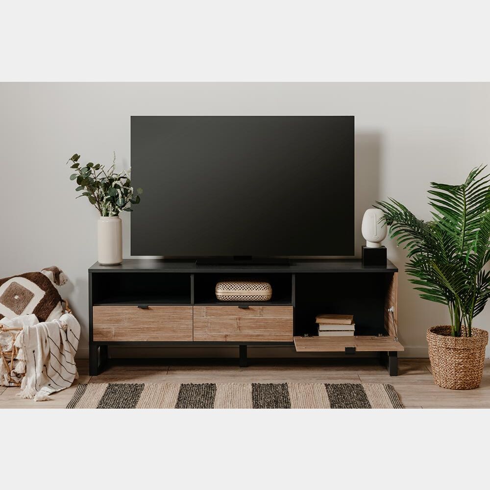 Nuovo porta tv con ante frontali in finitura Bamboo e struttura in finitura antracite. Il porta tv presenta due vani a giorno utile per l'appoggio di dispositivi elettronici, due cassetti e una ribalta con apertura dall'alto verso il basso.