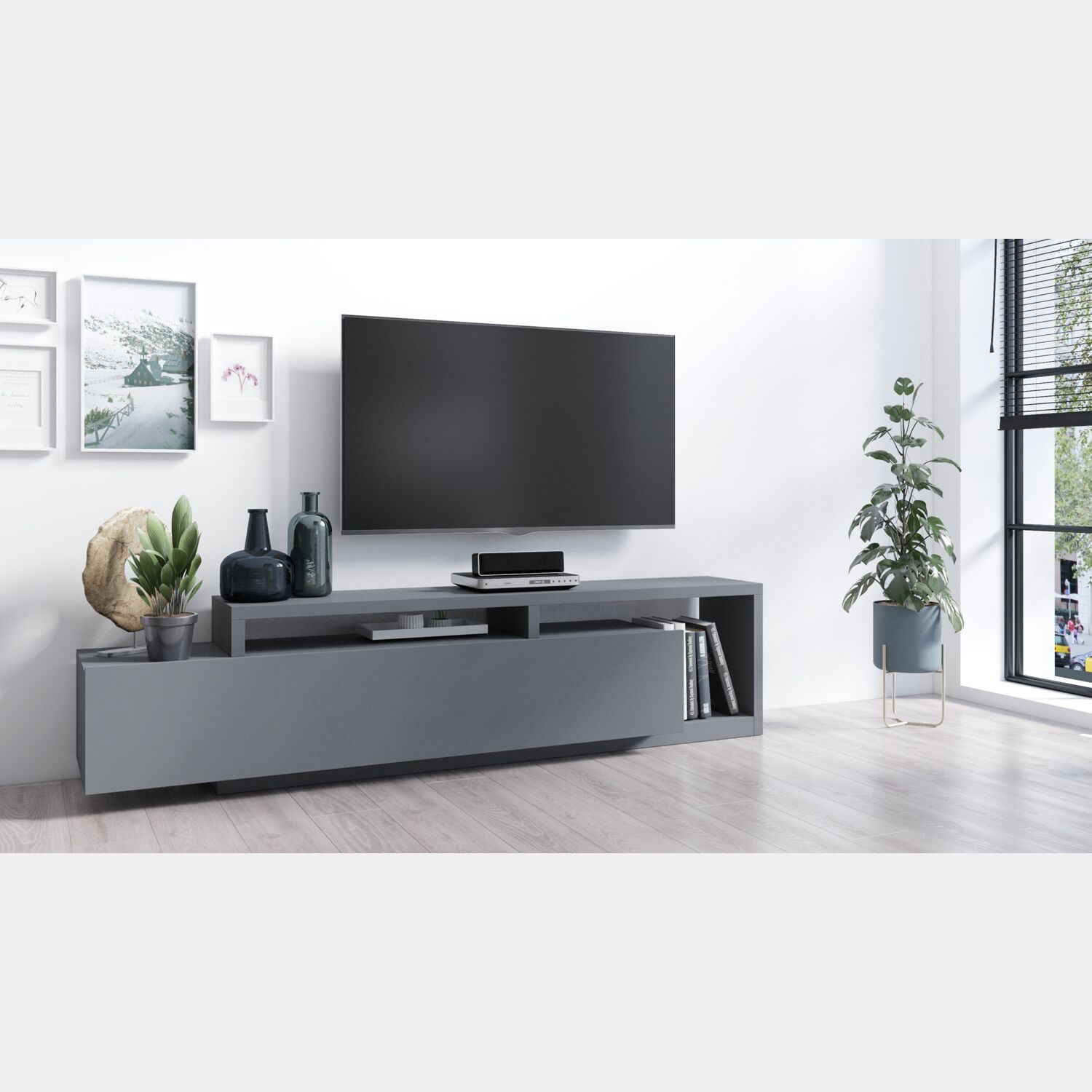 Mobile porta TV moderno realizzato in una struttura solida e resistente, finitura antracite, è caratterizzato da un campiente cassettone diviso in 2 adatto a contenere tutti i vostri oggetti e mantenere il salotto sempre in ordine.