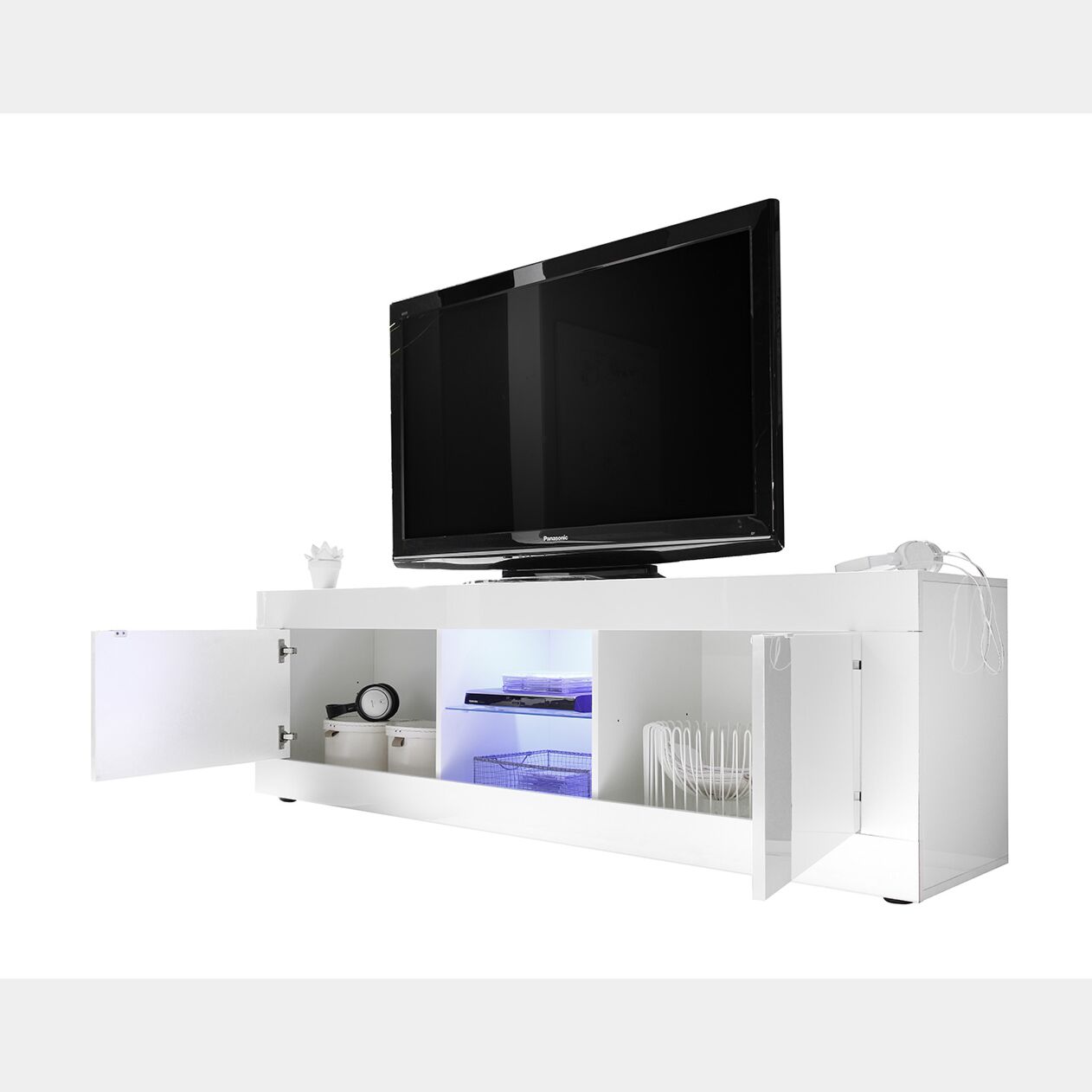 Molto spazioso e capiente, grazie all'ampia dimensione di profondità, può contenere anche oggetti di grandi dimensioni. Presenta 2 ante in legno ai lati e due ampie zone a giorno al centro divise da un ripiano in vetro dove poter riporre decoder, dvd, telecomandi, ecc.