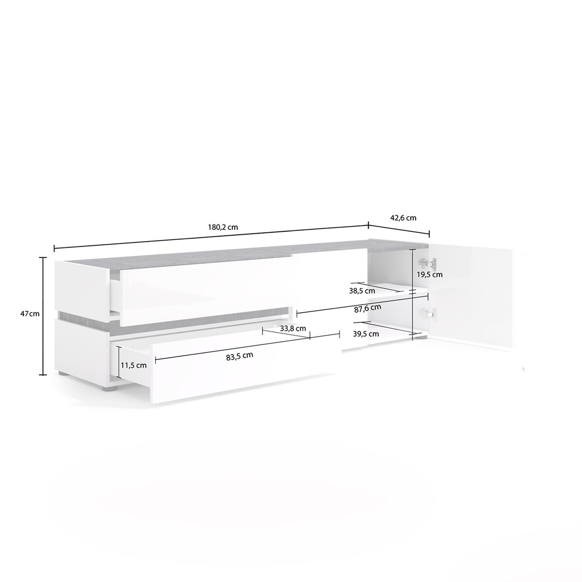 Il mobile tv è un complemento d'arredo che svolge un ruolo importante nel soggiorno, assicurando uno stile ben definito che caratterizza l'ambiente. Il porta tv viene presentanto in una delicata tonalità Bianco lucido contrastata da un'intensa tonalità di Grigio presente nella battuta e nel top.