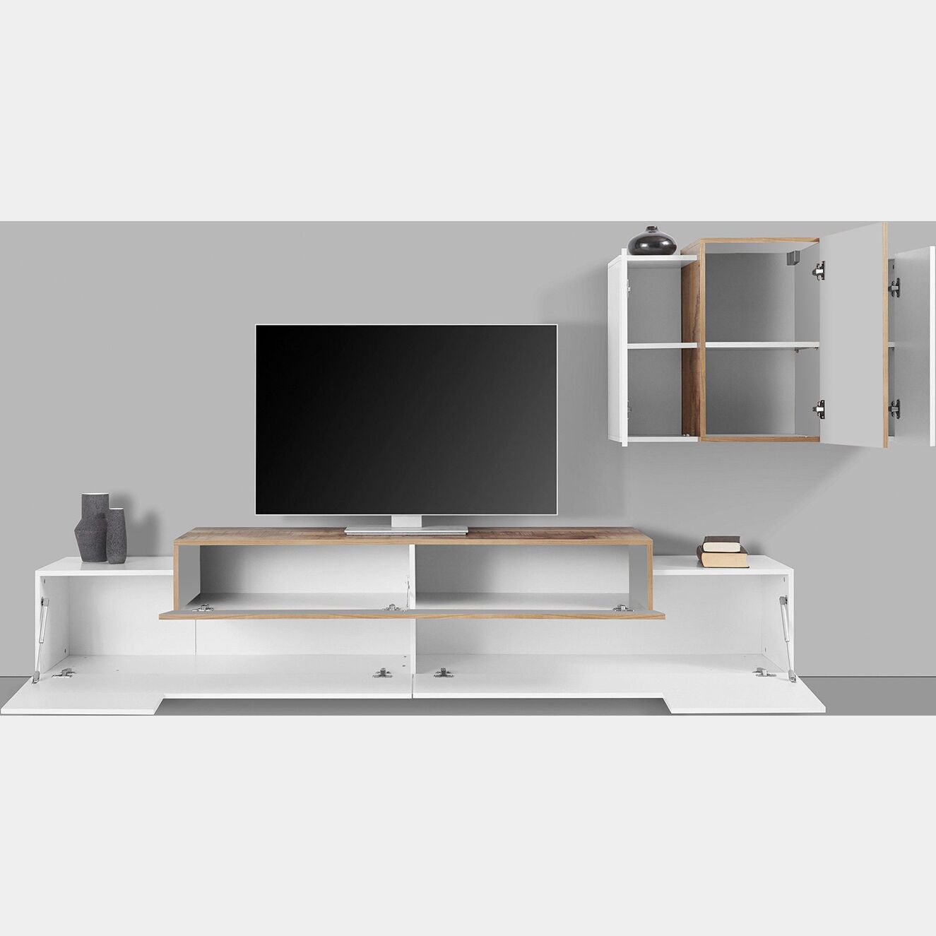 Il porta tv presenta 2 ribalte, la maggiore in finitura bianca mentre quella superiore in finitura ardesia. Centralmente è presente un divisorio. Il pensile sospeso invece prenseta 2 ante bianche e un'anta centrale di maggiori dimensioni color ardesia. All'interno del pensile è presente un ripiano centrale per anta.