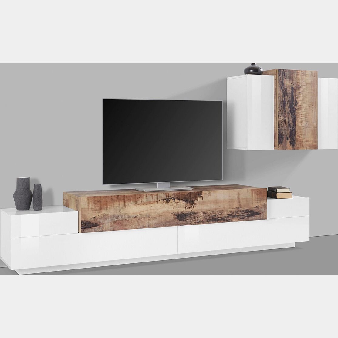 Porta Tv con pensile sospeso in finitura Bianco lucido e Pero