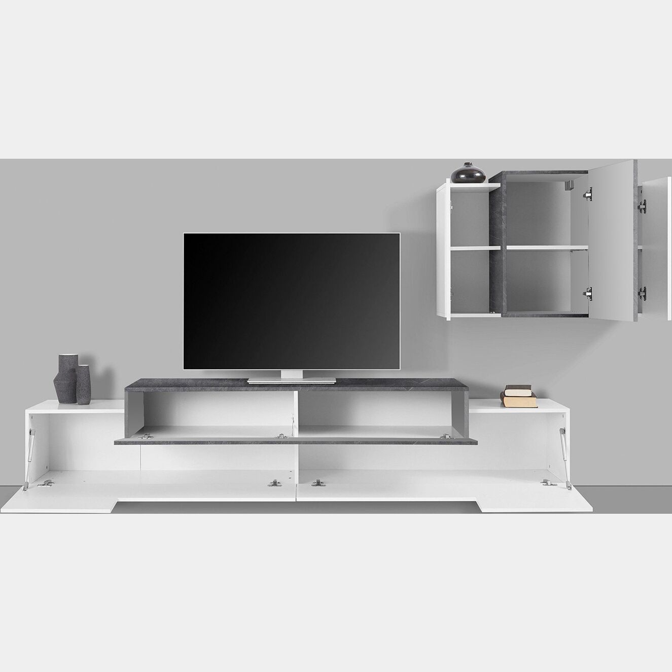 Il porta tv presenta 2 ribalte, la maggiore in finitura bianca mentre quella superiore in finitura ardesia. Centralmente è presente un divisorio. Il pensile sospeso invece prenseta 2 ante bianche e un'anta centrale di maggiori dimensioni color ardesia. All'interno del pensile è presente un ripiano centrale per anta.
