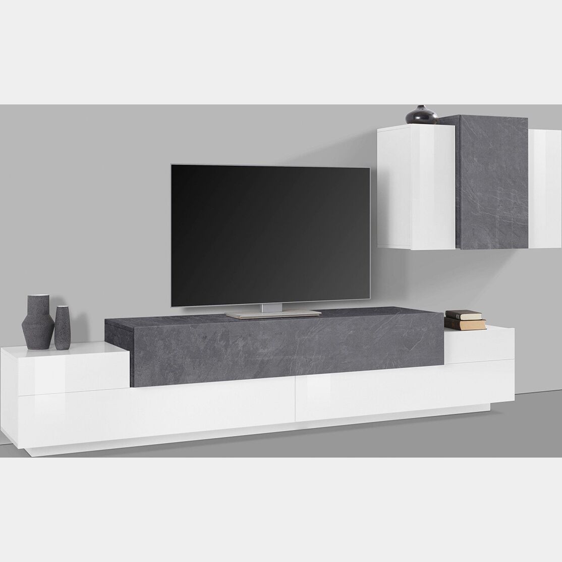 Porta Tv con pensile sospeso in finitura Bianco lucido e Ardesia