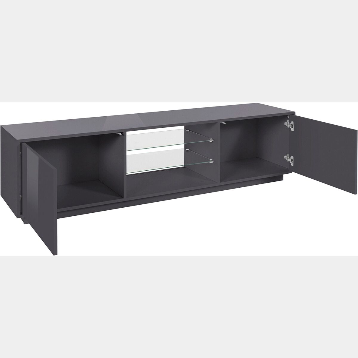 Porta tv di design in finitura laccato antracite con due ante e due mensole in vetro
