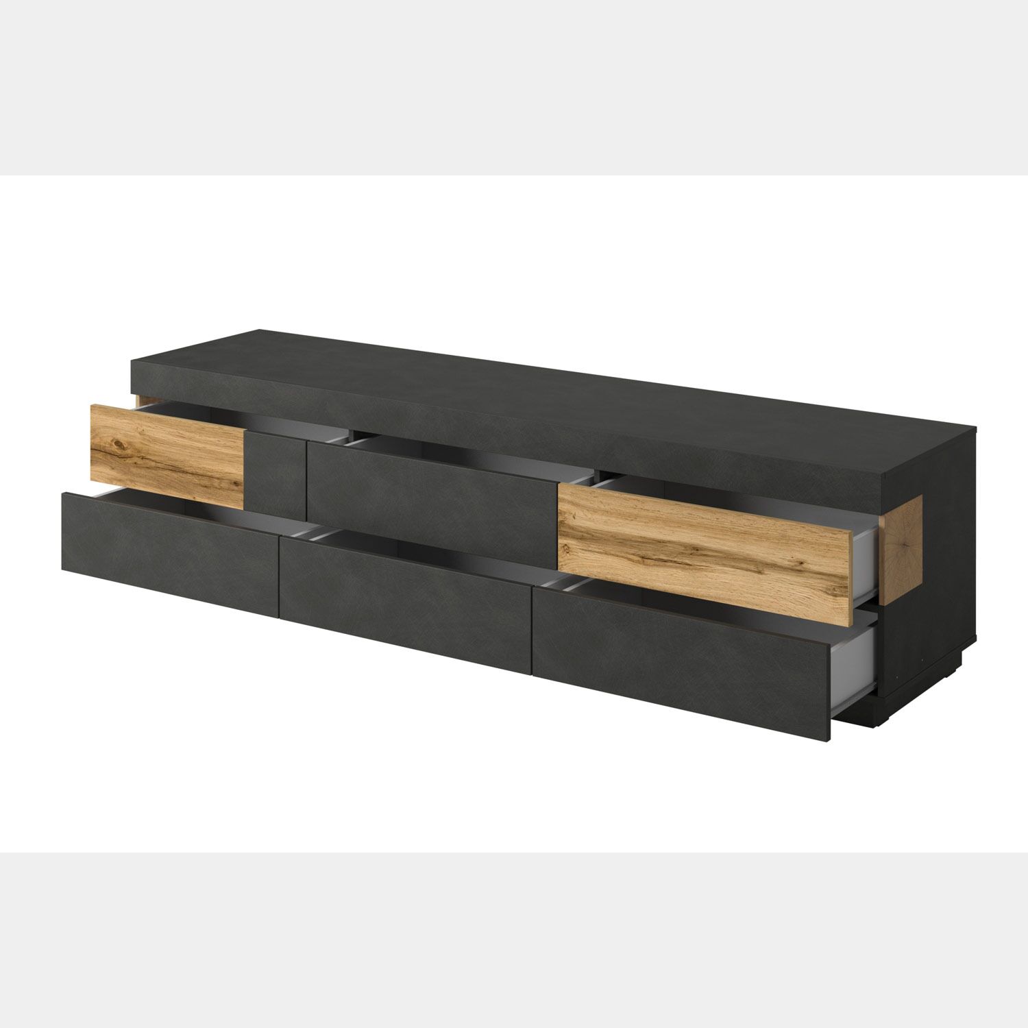 Il mobile porta TV della collezione Cracovia, modello grande, è composto da 6 pratici cassetti, perfetti per avere tutti gli accessori multimediali, i dvd, i cd sempre a portata di mano. Il top del porta TV può sostenere fino a 40 kg di peso.