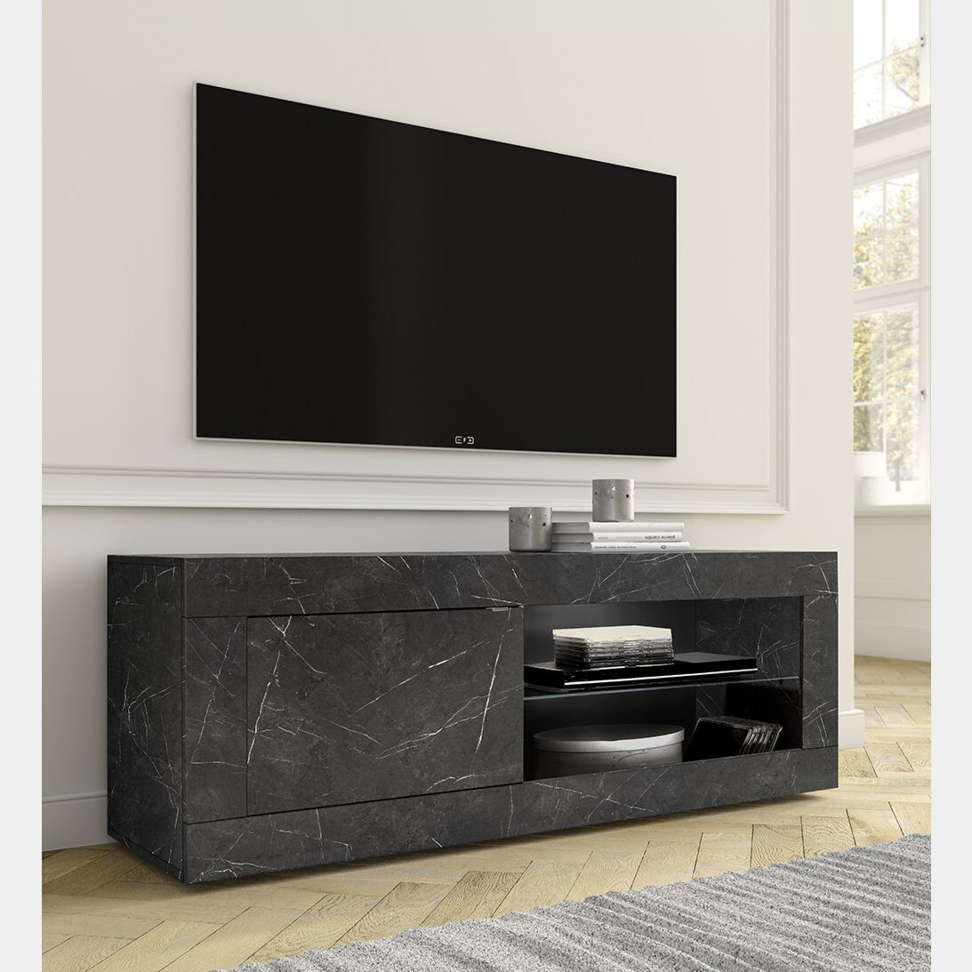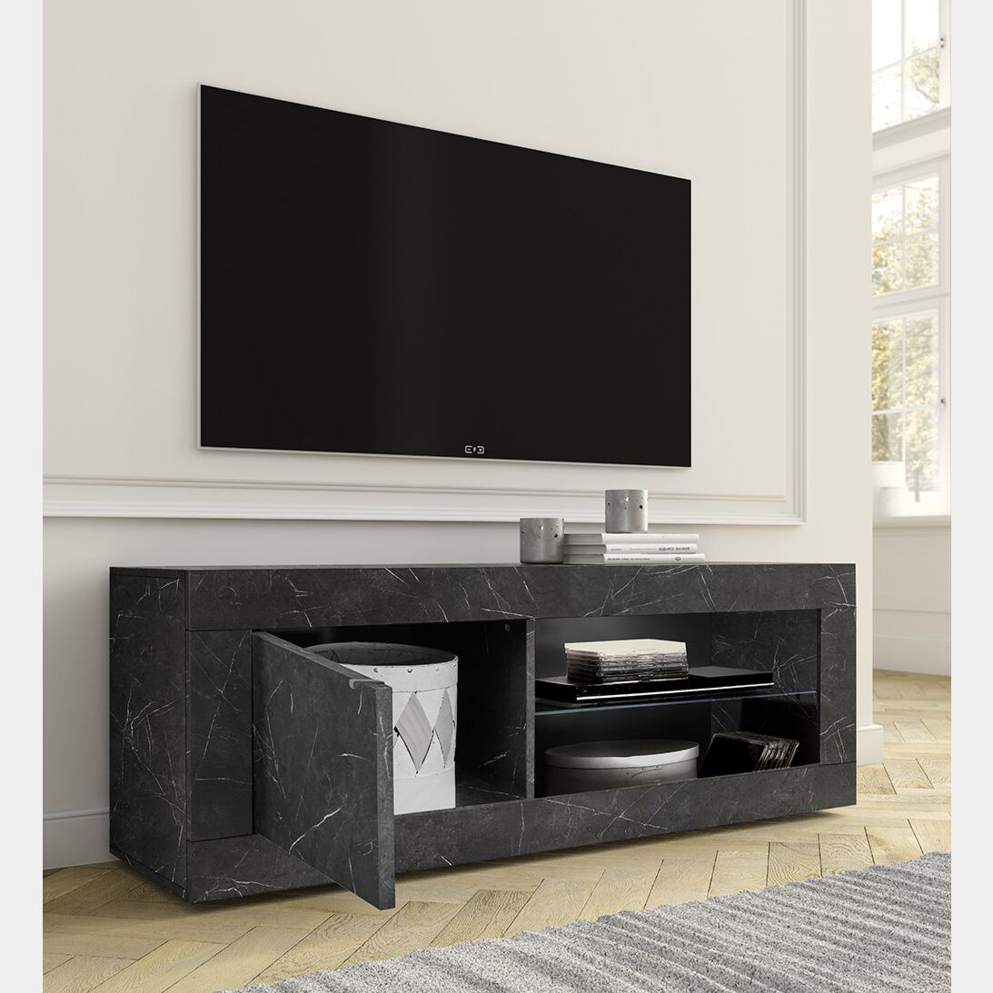 Pratico, moderno e funzionale il Porta TV di design effetto marmo nero si contraddistingue per la sua finitura elegante.