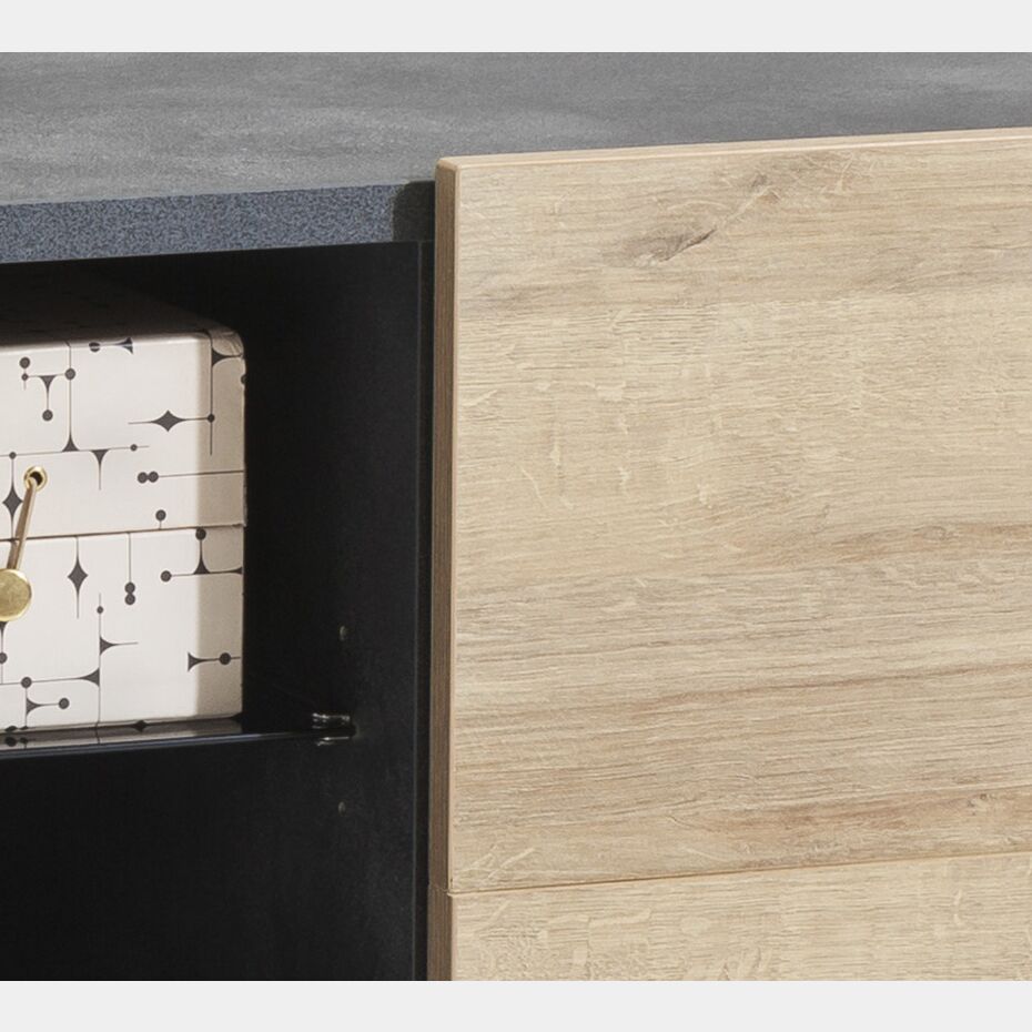 Il porta Tv presenta le caratteristiche finiture dello stile industry: l'Antracite abbinato al Rovere.