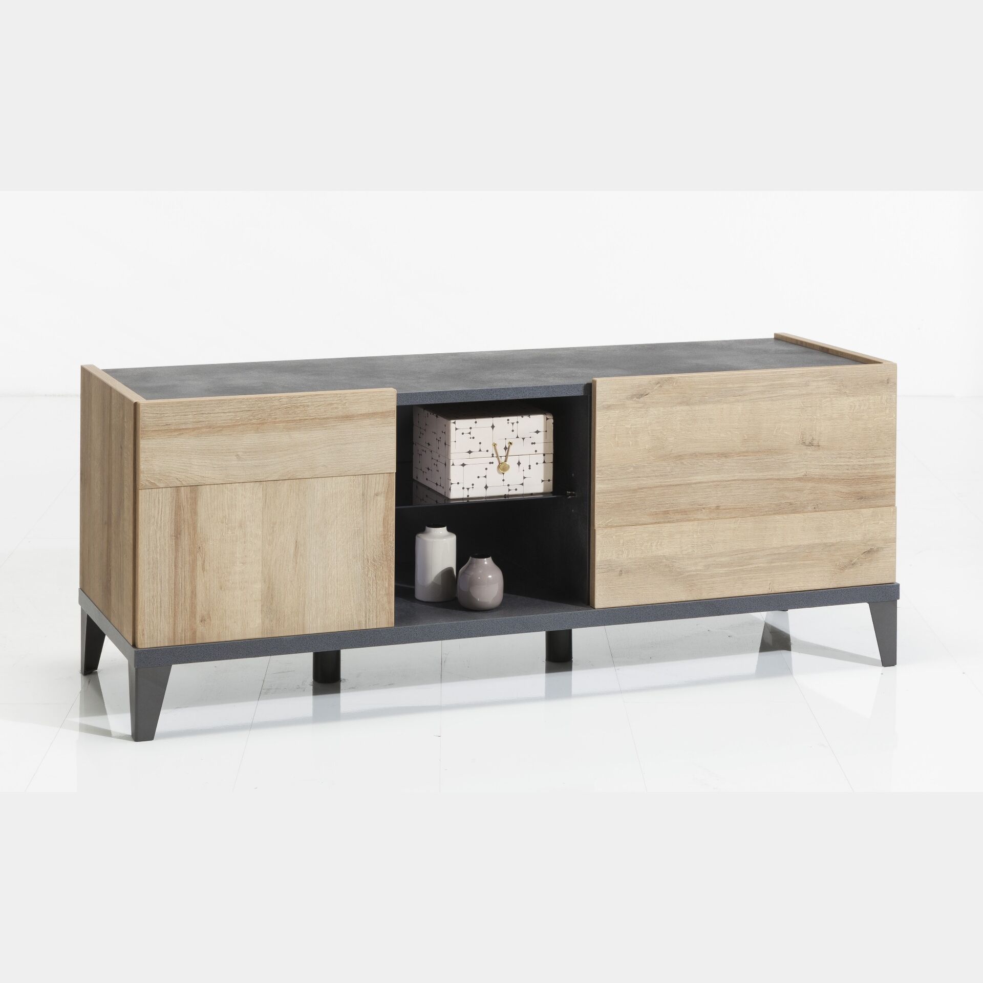 Dotato di una ribalta, un'anta e un ripiano cnetrale offre un ampio spazio di appoggio per oggetti di uso quotidiano, il risultato è un prodotto moderno e pratico. Il porta tv presenta 6 gambe di supporto, i frontali sono in Rovere mentre il piano superiore e il vano a giorno sono in Antracite.