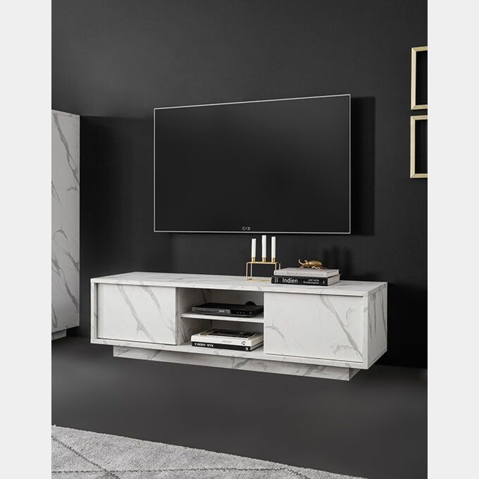 Porta TV moderno, 2 ante in finitura effetto Marmo Bianco di Carrara