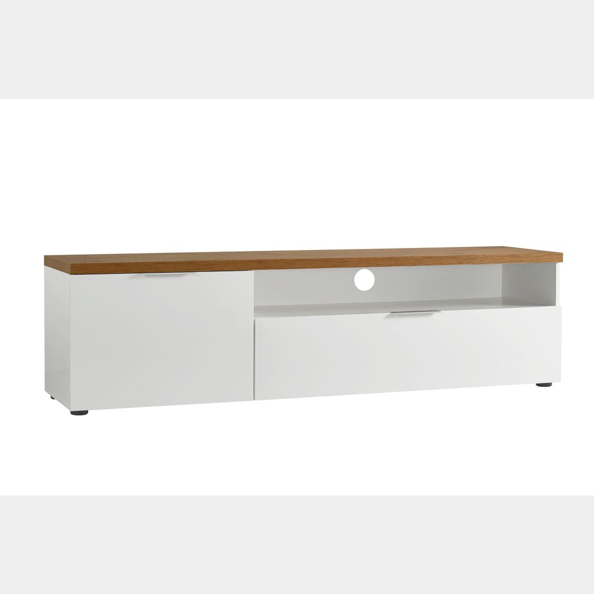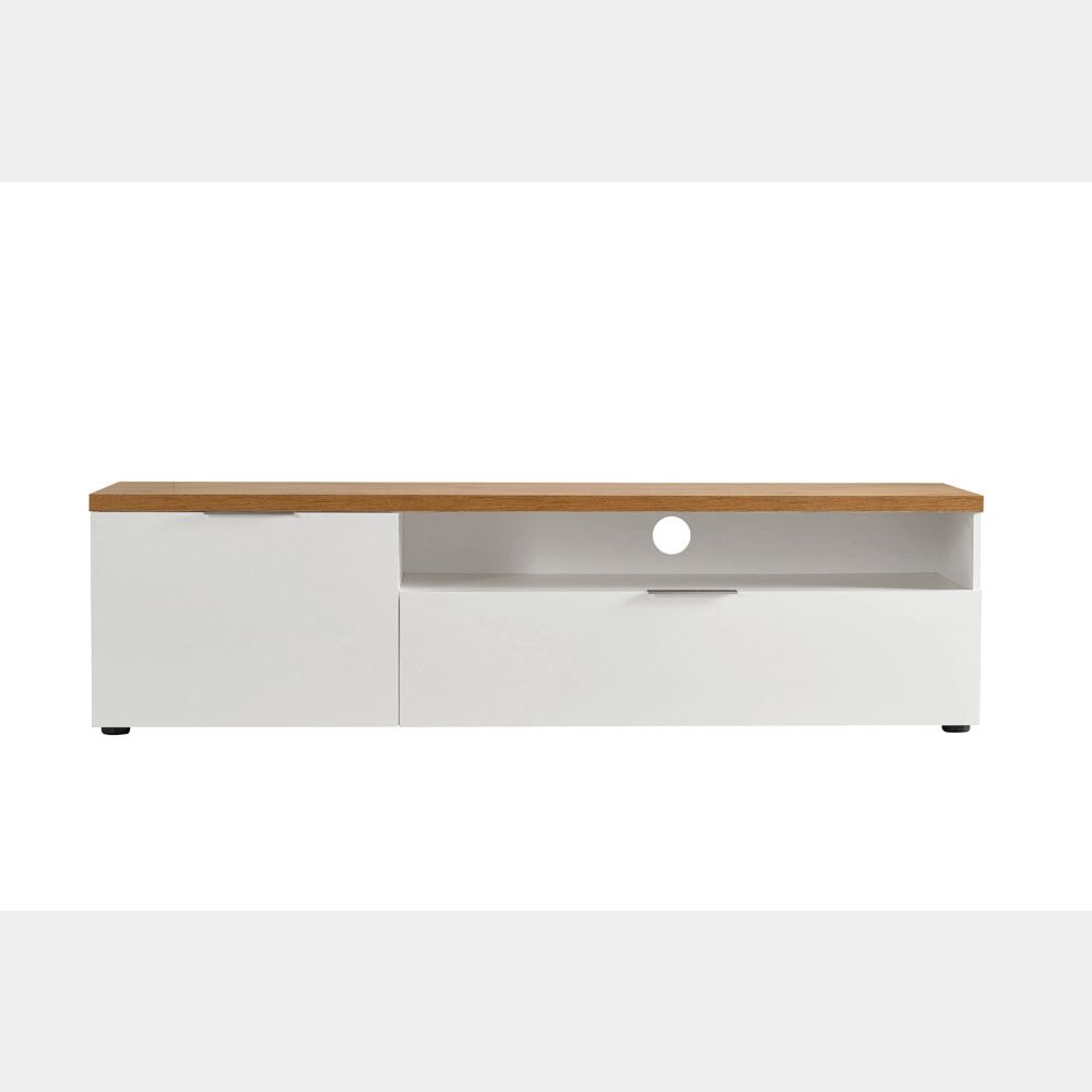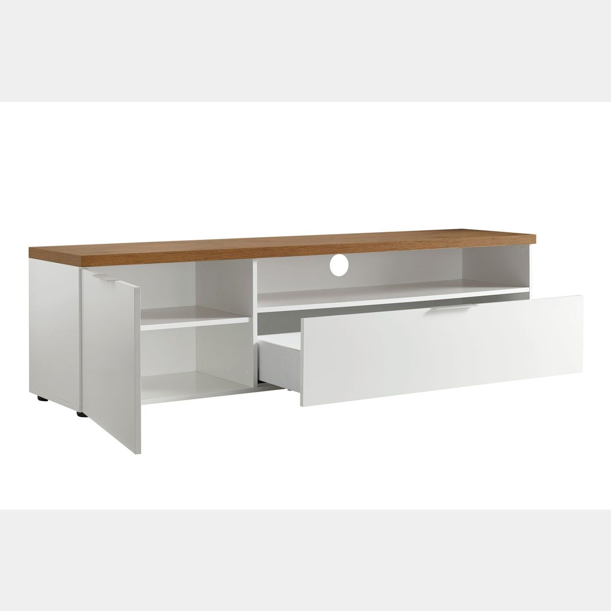 Esso presenta un'anta con all'interno un pratico ripiano, un capiente cassettone e un vano a giorno con foro passacavi adatto per posizionare decoder, consolle, modem.