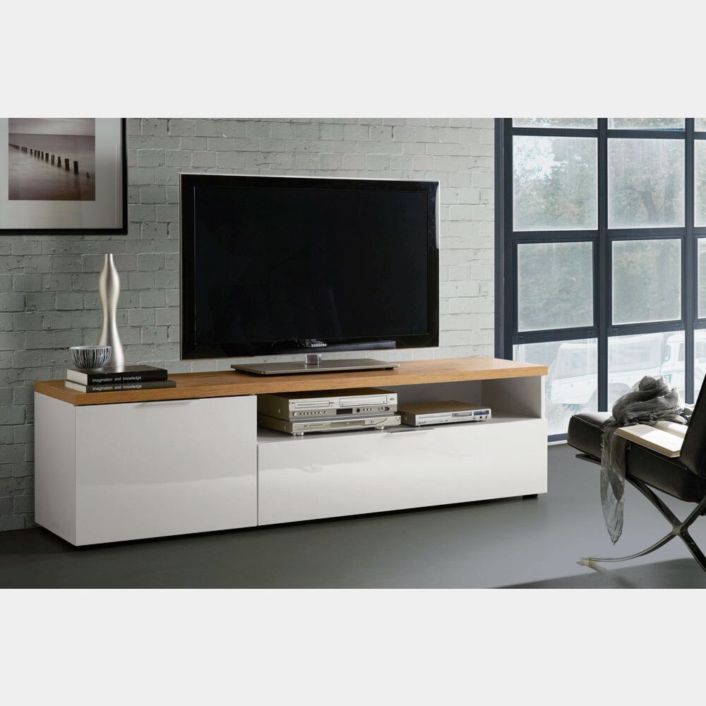 Porta TV moderno L.180 cm finitura Bianco laccato lucido e Castagno