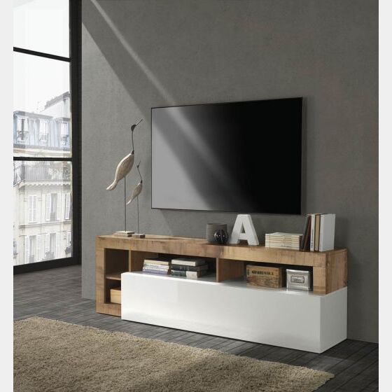 Mobile tv moderno in finitura bianco laccato lucido e pero. Questo porta tv fa parte della collezione Treck, grazie al suo design ricercato rende l'ambiente personalizzato, inoltre si adatta facilmente a tutti i tipi di soggiorni.