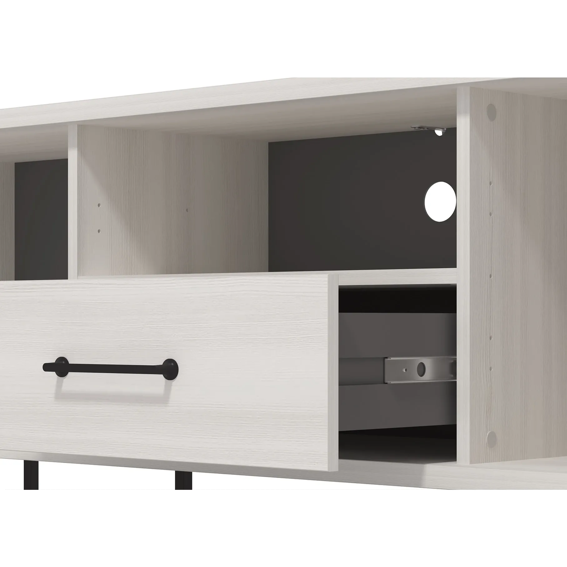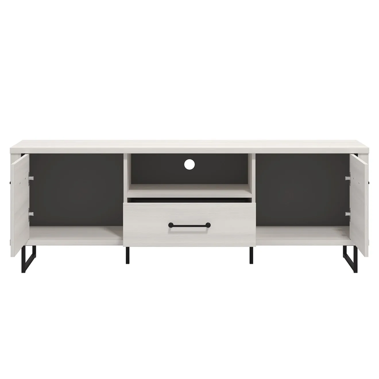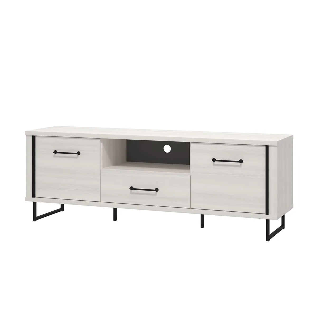 Il porta tv è composto da ante battenti laterali, un cassetto centrale ed un vano a giorno. Lo schienale è dotato di foro passacavi.