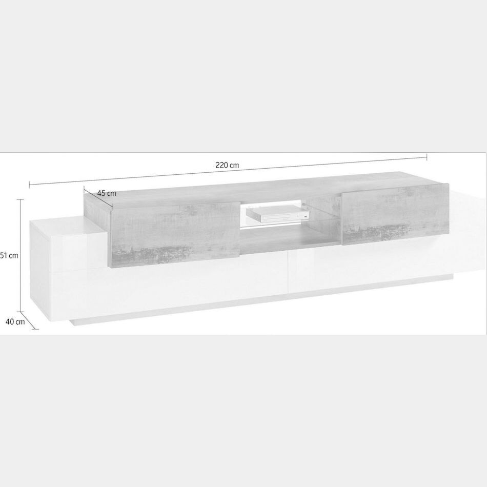 Il porta tv è rifinito in Bianco lucido e Pero, la contrapposizione di queste finiture genera un prodotto di grande impatto visivo che diventerà protagonista del tuo soggiorno. Il mobile tv è disponibile anche nella versione in Bianco lucido e Ardesia.