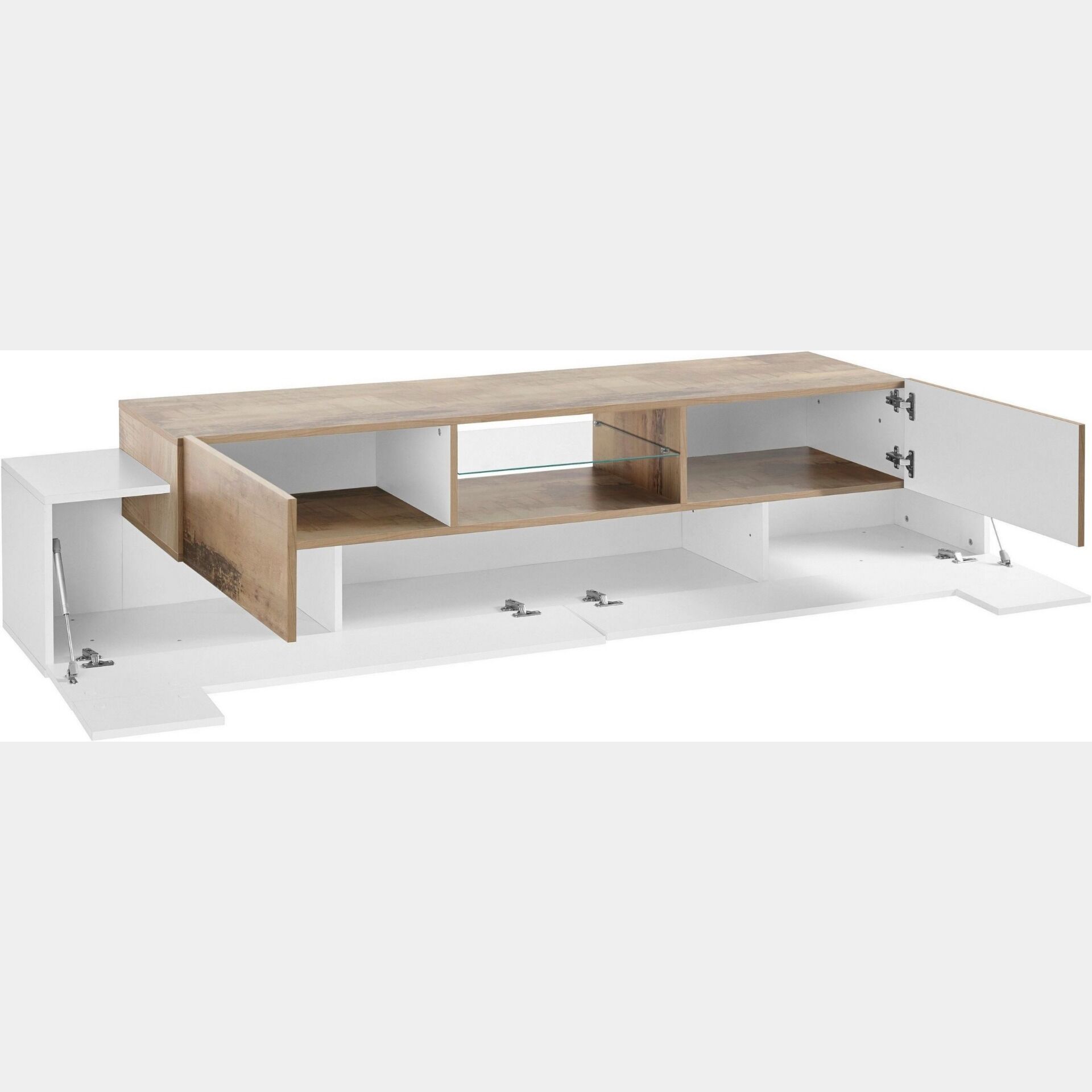 Il mobile porta tv presenta una struttura che offre un'ampia capienza: dotato di 2 ante, 2 ribalte ed un ripiano in vetro assicura una totale praticità nel quotidiano.