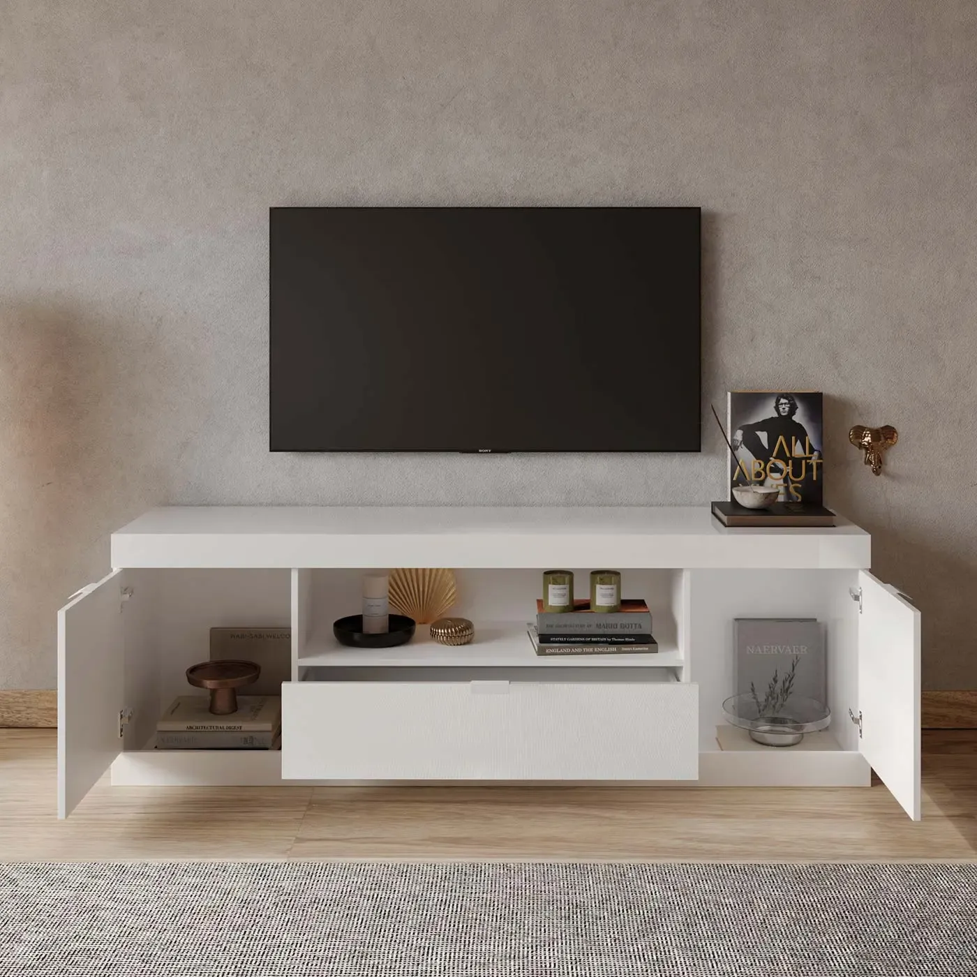 Il mobile tv prevede 2 ante, un vano a giorno superiore ed un cassetto inferiore. La suddivisione dello spazio assicura una notevole capienza per controller, dvd, telecomandi e giochi.