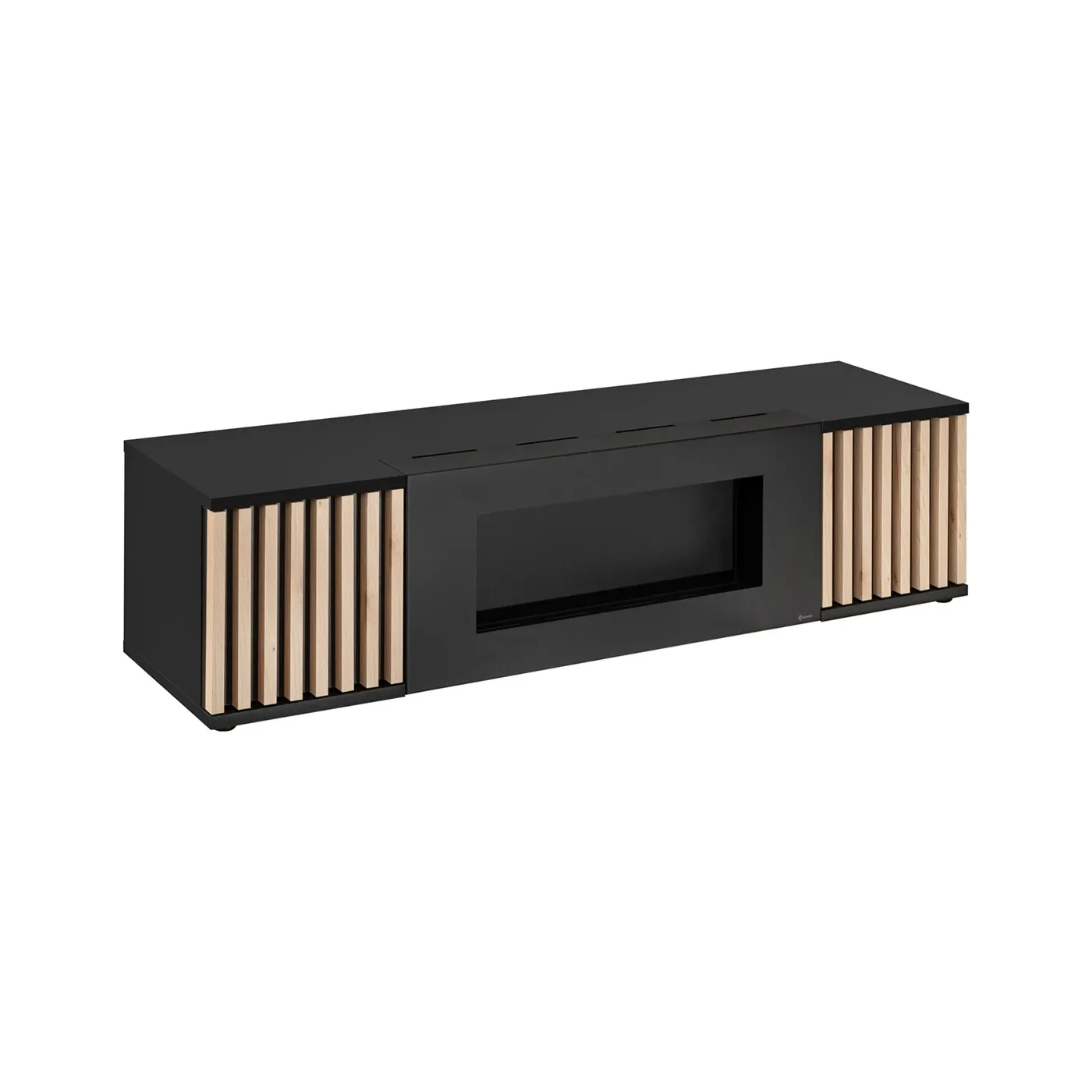 Porta TV Cannettato con biocaminetto, 164x42x45 h cm, Nero e Frassino olivato