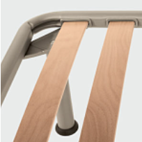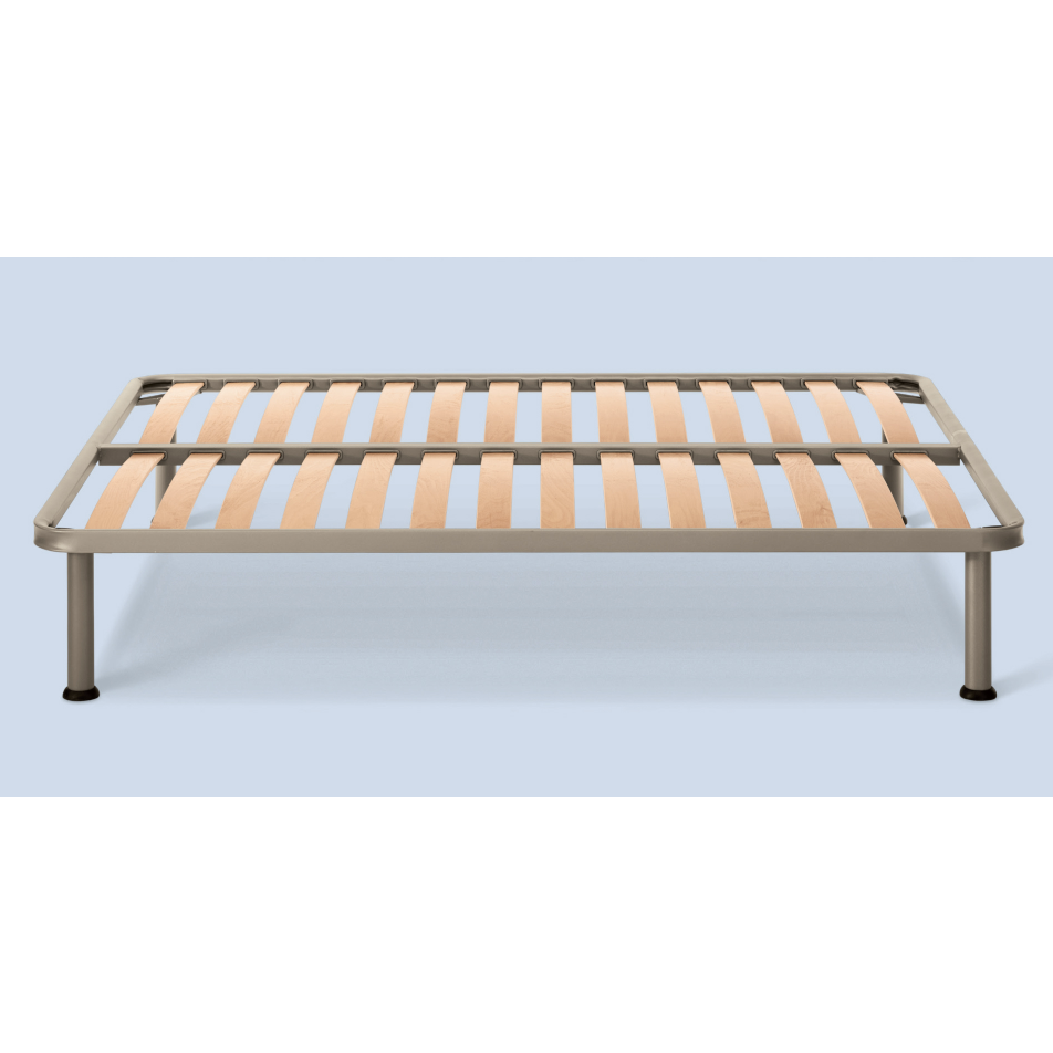 Questa rete, realizzata con profilo personalizzato in tubolare curvato da 40×33 mm (spessore 1,25 mm) in acciaio ad alta resistenza monta 14 listelli in multistrato di faggio vaporato da 68×8 mm verniciato ad acqua.