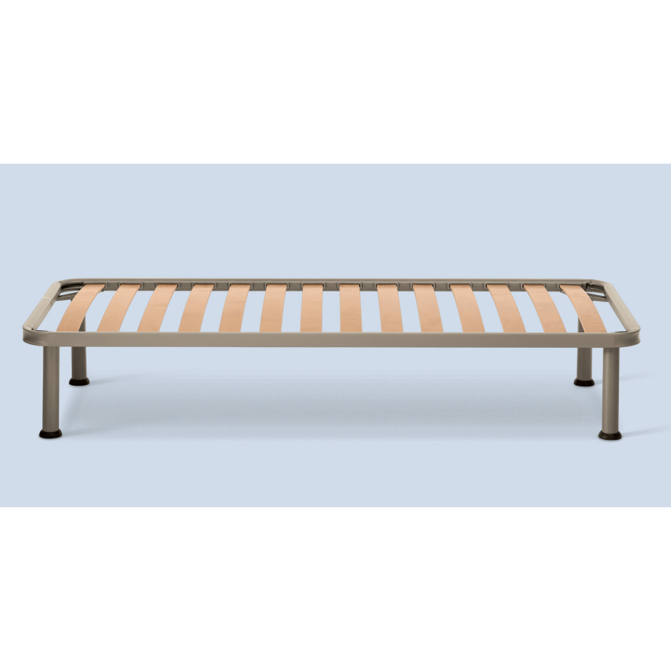 Questa rete, realizzata con profilo personalizzato in tubolare curvato da 40×33 mm (spessore 1,25 mm) in acciaio ad alta resistenza monta 14 listelli in multistrato di faggio vaporato da 68×8 mm verniciato ad acqua.