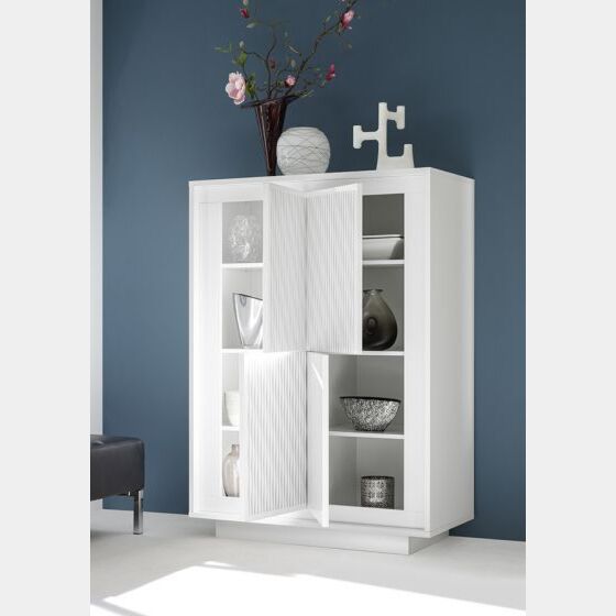 Madia vetrina a 2 ante vetro, dotate di chiusura ammortizzata. La struttura è in bianco laccato opaco, come lo zoccolo. I frontali sono a serigrafia sigaretta.