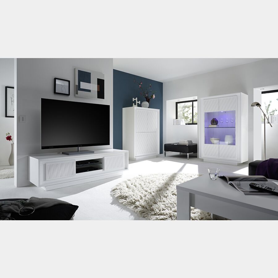 Sala completa, solo come in foto, finitura bianco opaco, con frontali serigrafia sigaretta.La sala è composta da Porta TV, Madia alta a 4 ante e Vetrina a 2 ante.