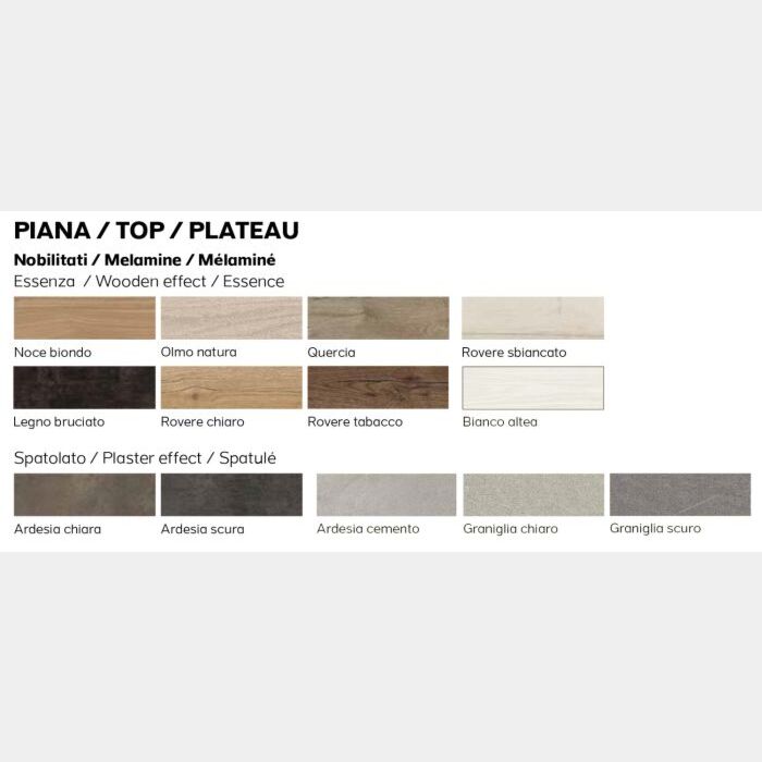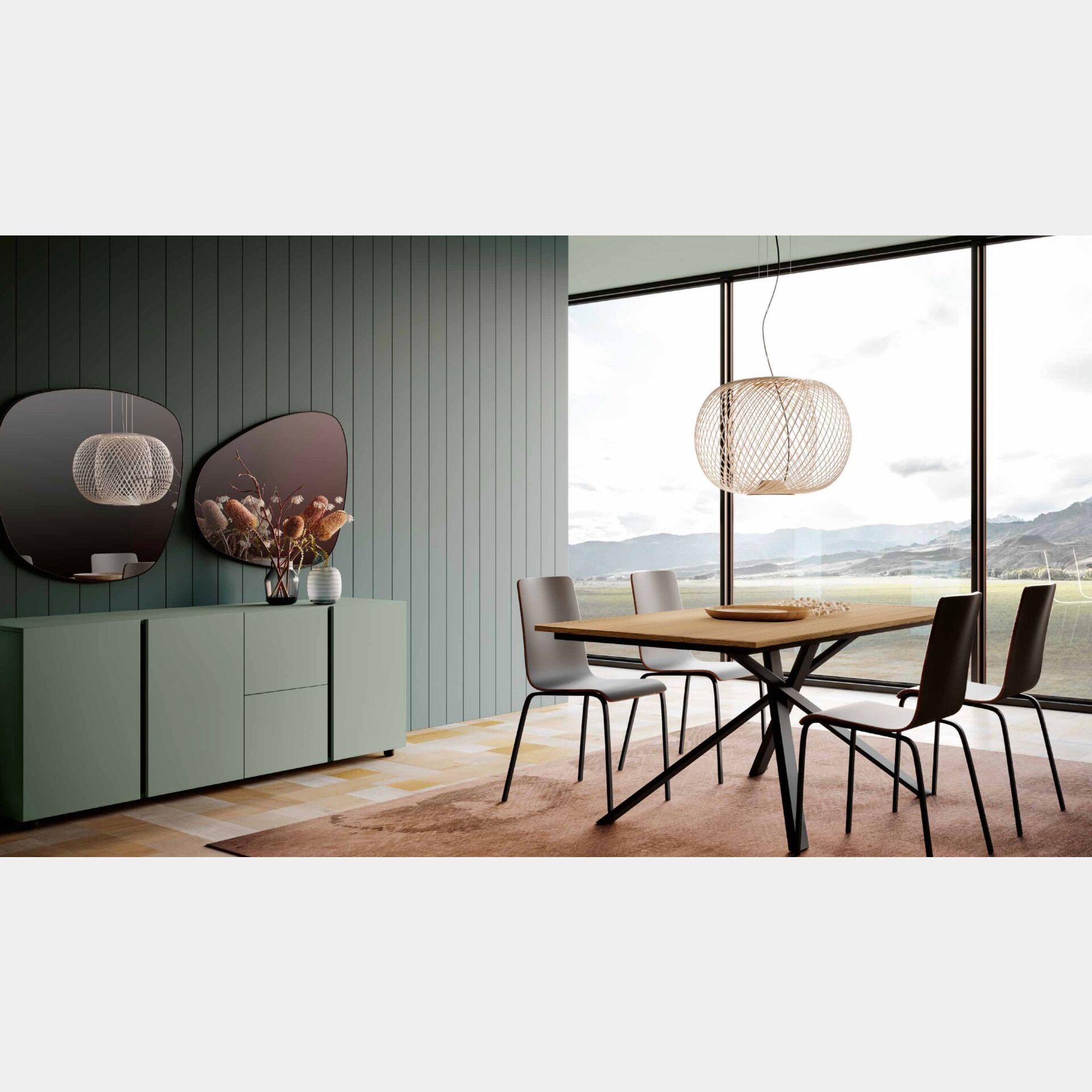 La madia ha 3 ante e 2 cassetti con meccanismo di chiusura a molla di richiamo e ammortizzatore. Gli spessori delle ante e struttura variano da 18 e 22 mm a 14-18-22-40 mm. La madia è disponibile in diverse finiture. In questo caso la finitura è Agave. La madia viene fornita con piedini rasoterra neri.