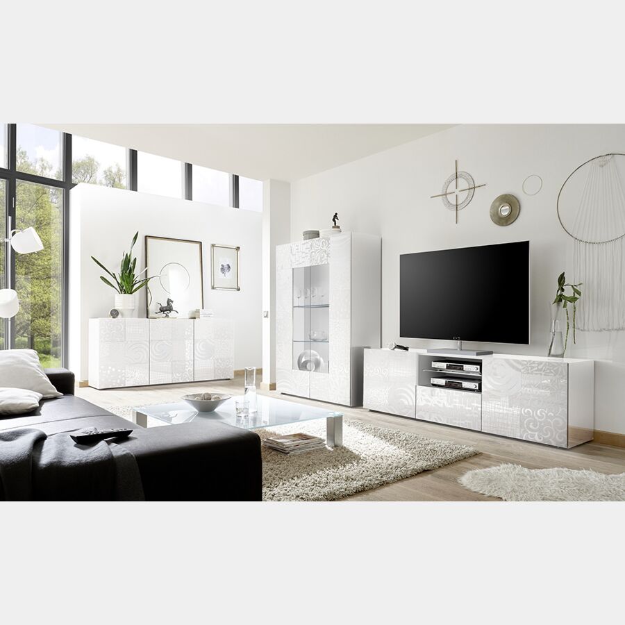 Sala completa di base porta tv, madia 3 ante e vetrina in bianco laccato lucido serigrafato