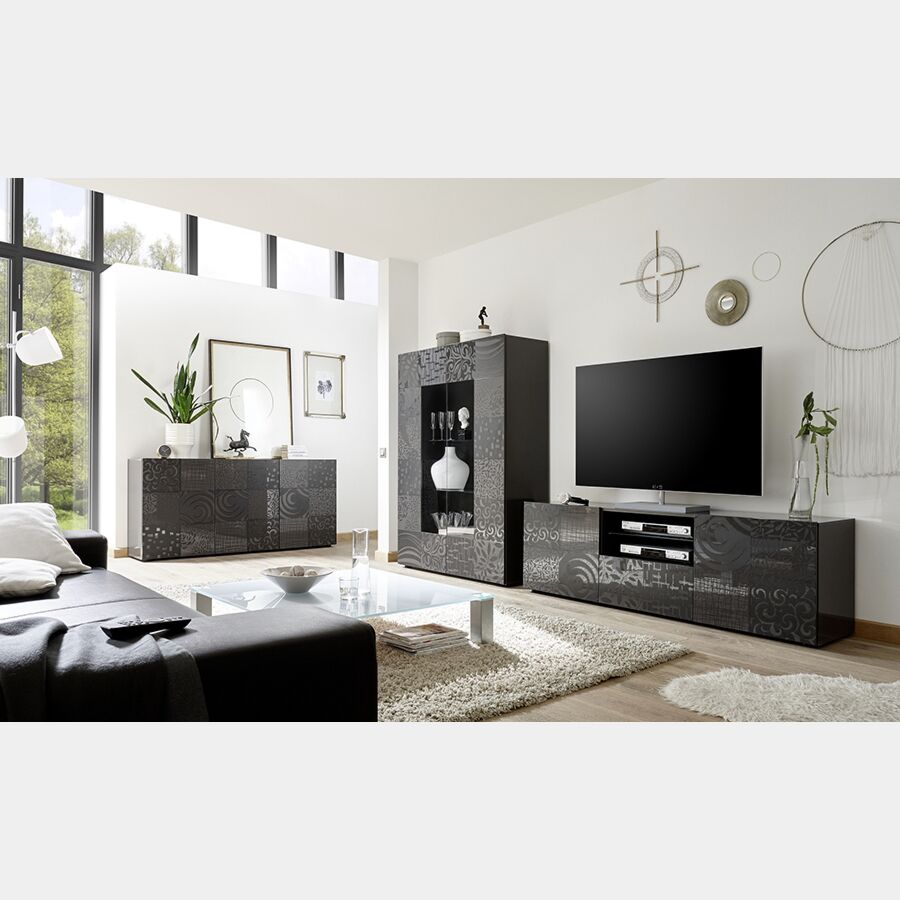Sala completa di base porta tv, madia 3 ante e vetrina in grigio serigrafato