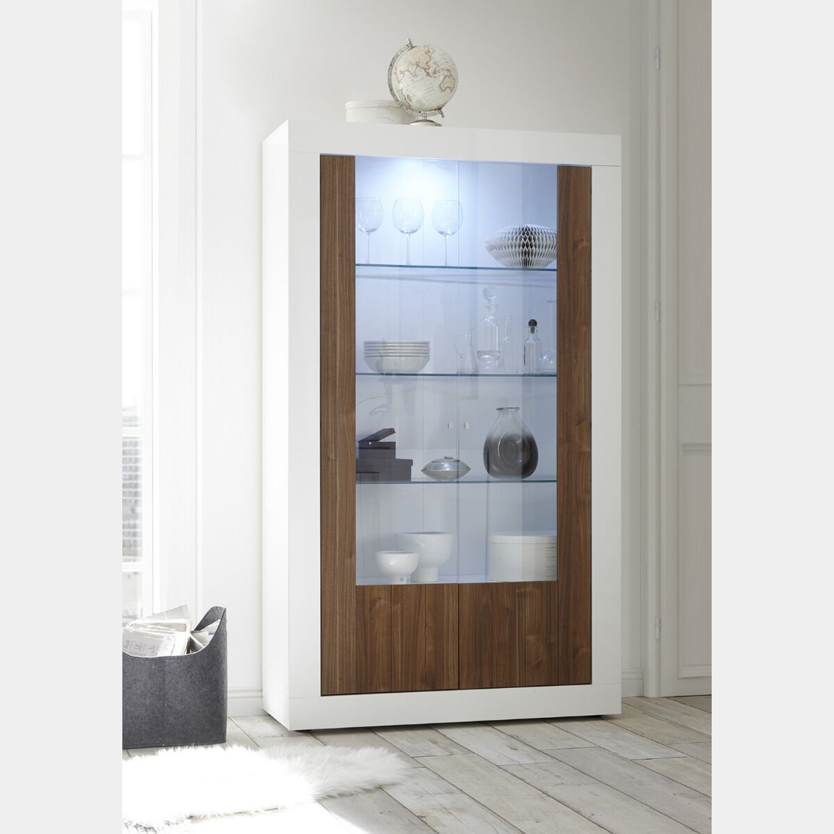 - Vetrina 2 ante e 3 mensole: una soluzione elegante per soggiorni o cucine. Lo stile pulito della vetrina la rende unica. La sua struttura è completamente bianca lucida e con uno spessore di 22 mm per le fasce garantisce solidità. Le due ante in vetro sono contornate dalla finitura noce dark. Gli interni invece sono bianchi opachi. All'interno la vetrina ha 3 ripiani in vetro temperato da 8mm, le stesse ante in vetro sono in vetro temperato da 4mm.
