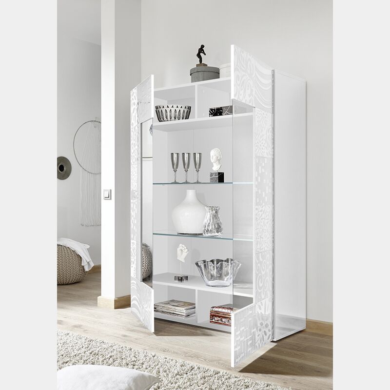 - Vetrina a 2 ante, moderna e di design in finitura bianco laccato lucido con serigrafie. La vetrina all'interno è divisa da 2 ripiani in vetro spessore 8mm e poi vi sono altri due ripiani in legno che a loro volta sono divisi a metà orizzontalmente.