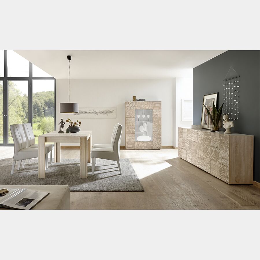 Sala completa di tavolo, madia e vetrina in rovere serigrafato