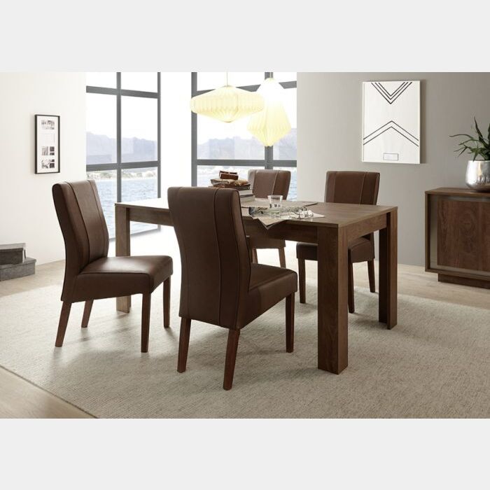 Tavolo da pranzo cognac. La struttura dei mobili sono in bianco laccato opaco, come i zoccoli. I frontali sono in finitura cognac. Il tavolo da pranzo cognac, a richiesta può essere fisso, o allungabile, ed è disponibile in due dimensioni da 180 e 140 cm di lunghezza. E' disponibile con una allunga da 48 cm, può essere riposta comodamente all'interno del tavolo.