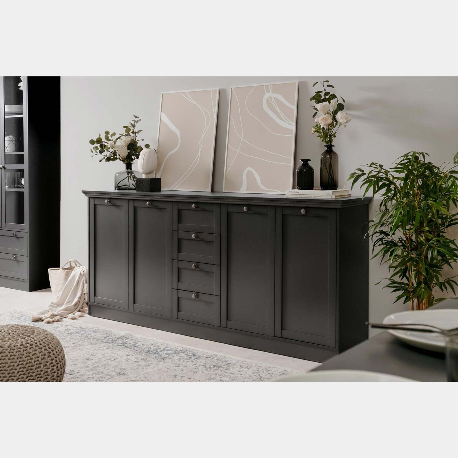 Sala di design in finitura grigio antracite completa di due madie e vetrina