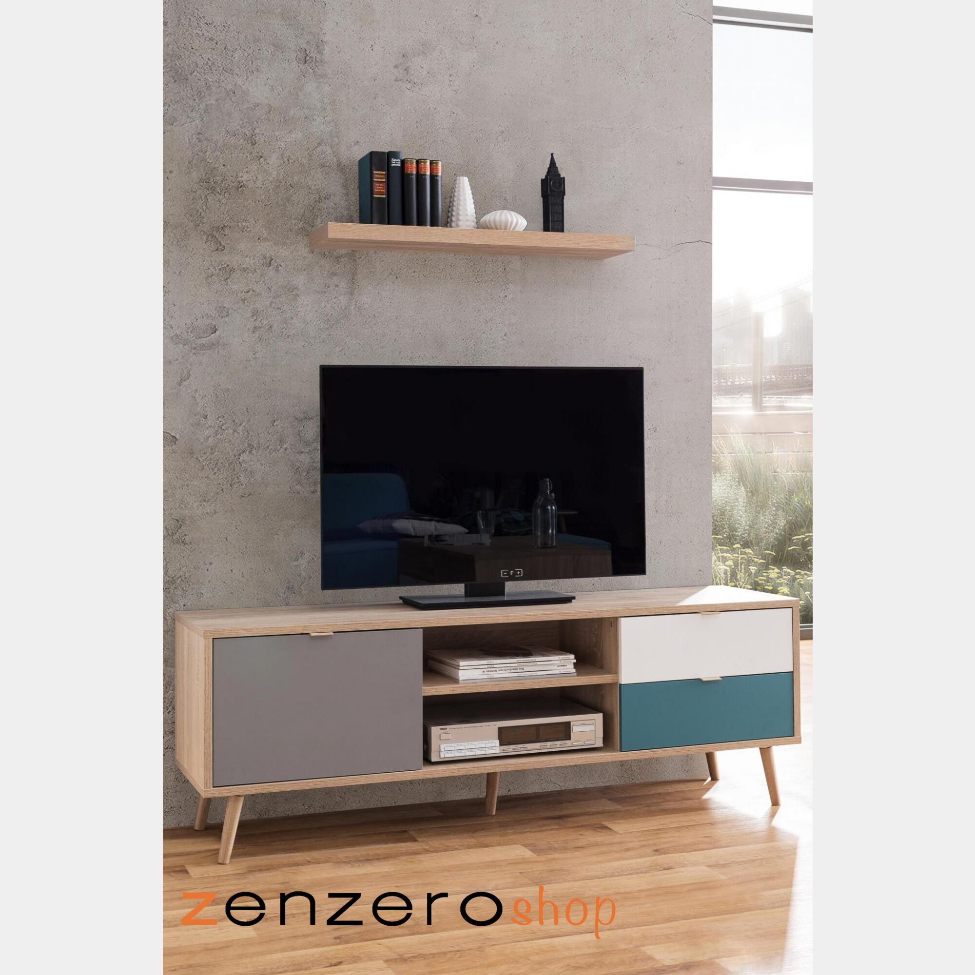 - Porta TV di design con gambe in legno, 1 anta 2 cassetti, finitura Quercia, Bianca, Petrolio e GrigiaPorta tv con 1 anta 2 cassetti, struttura melaminica. Il porta tv è nella finitura Quercia e un tris di colori quali Bianco, Petrolio e Grigio. Il porta tv all'interno dell'unica anta ha un ripiano, mentre i due cassetti sono dotati di guide in metallo per una migliore scorrevolezza. Al centro del porta tv invece c'è un vano a giorno con una mensola. La schiena del vano ha un foro passacavi.