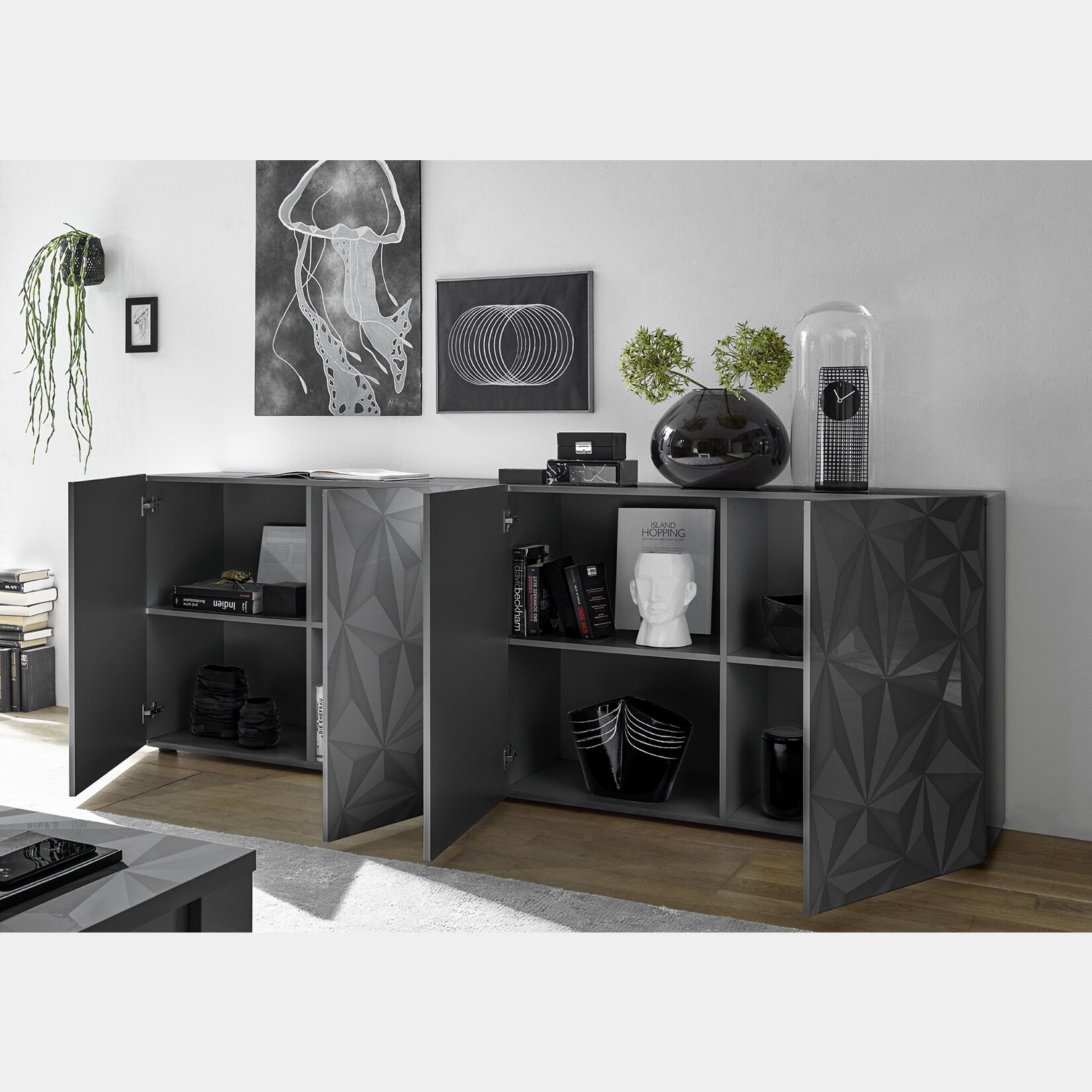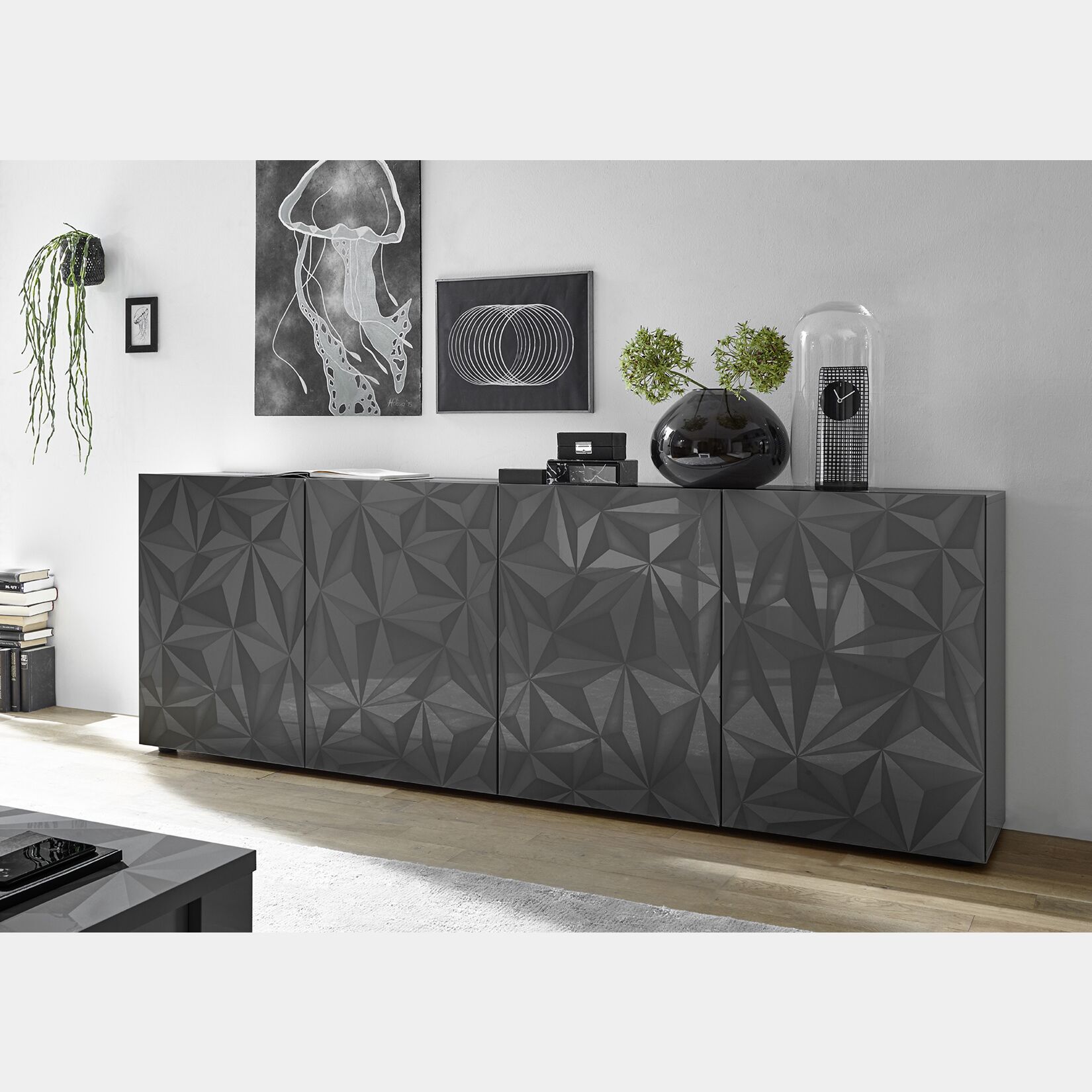 - Madia moderna 4 ante in finitura grigio laccato lucido con serigrafia prismatica. Madia a 4 ante, moderna e di design. La madia è serigrafata con decorazione prismatica e in finitura grigio laccato lucido. All'interno la madia è suddivisa da 1 ripiano per ogni anta battente.