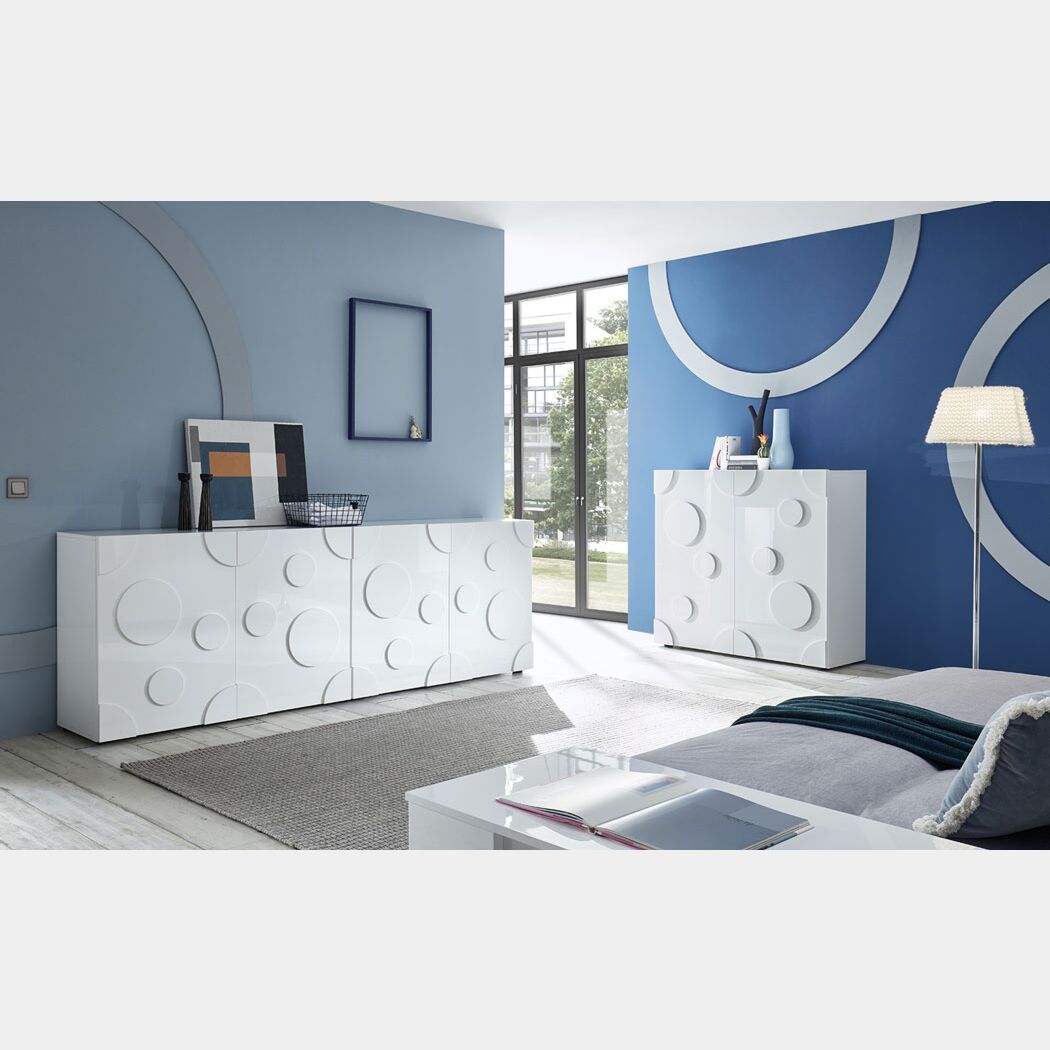 La Madia moderna Made in Italy presente in questa composizione per zona giorno è formata da 4 ante battenti con cerciere in metallo, non ammortizzate. Il mobile si adatta perfettamente ad ogni tipo di arredamento grazie alla finitura Bianca Laccata Lucida che infonderà luminosità nella stanza. Sulle 4 ante battenti sono fissate delle decorazioni a forma di cerchio con spessore 1 cm. All'interno il mobile con cerchi è bianco opaco ed ha tre tramezzi che suddividono lo spazio in 4 vani da 55 cm circa.