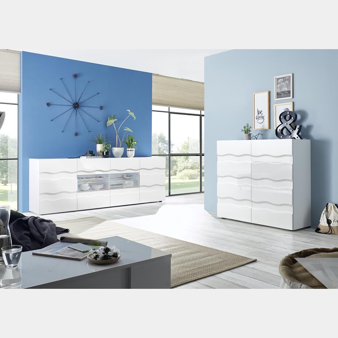 Sala moderna, composta da 2 Madie onda, 2 ante e 2 ante 4 cassetti, Bianco lucido