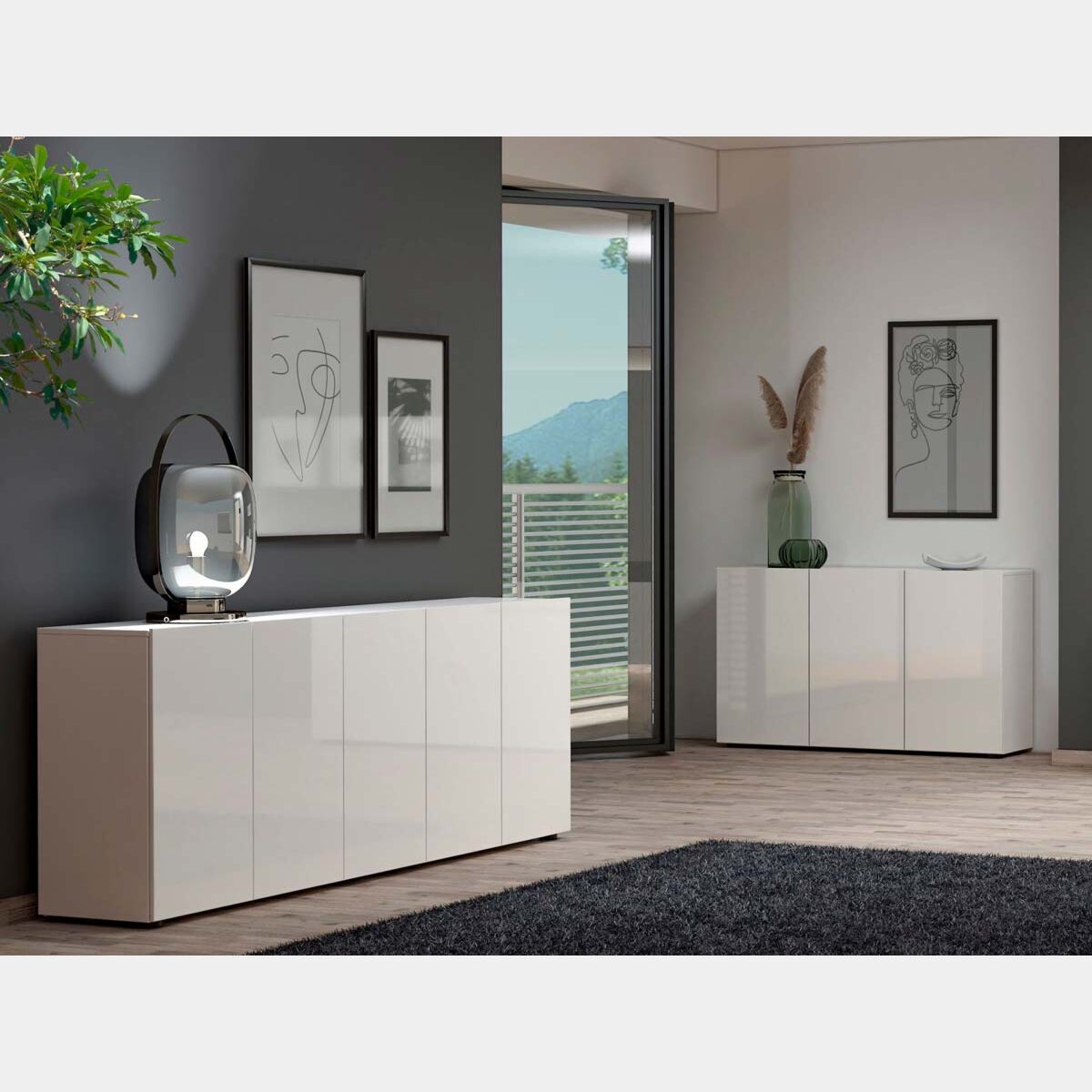 Sala moderna composta da 2 spaziose madie, finitura Bianco lucido