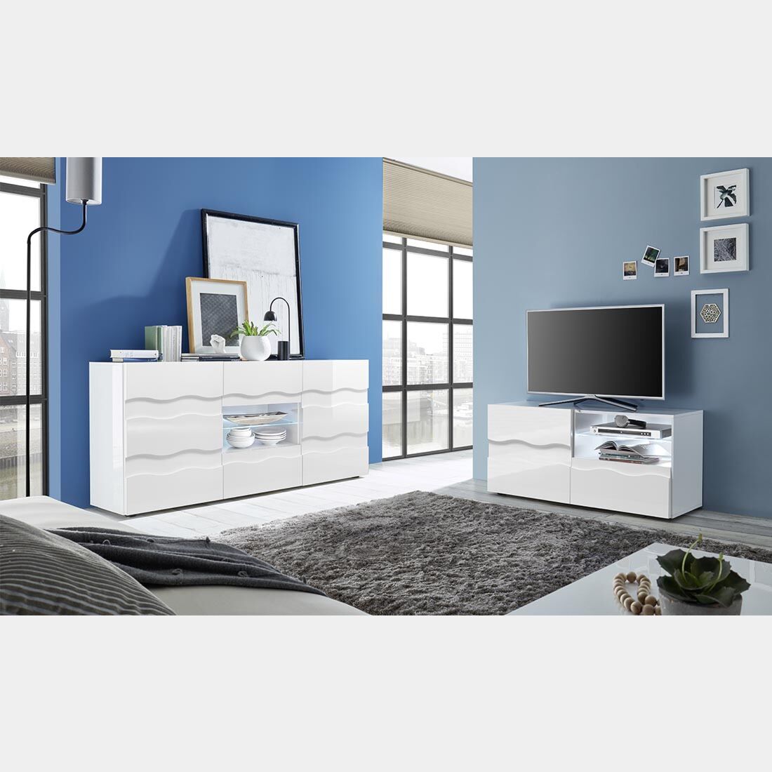 Sala moderna, composta da Madia e Porta TV Onda, Bianco Lucido