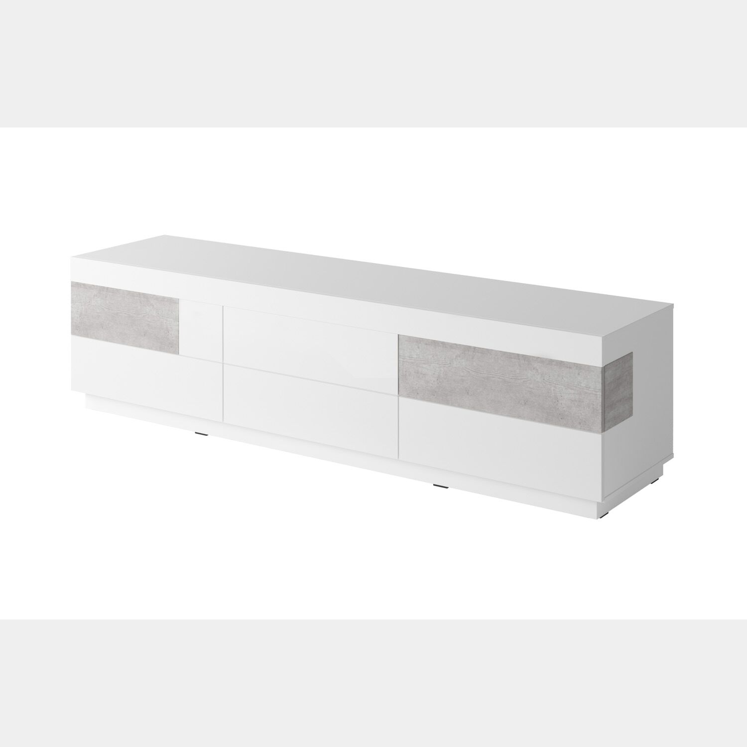Sala moderna composta da porta TV e vetrina, grigio cemento e bianco lucido
