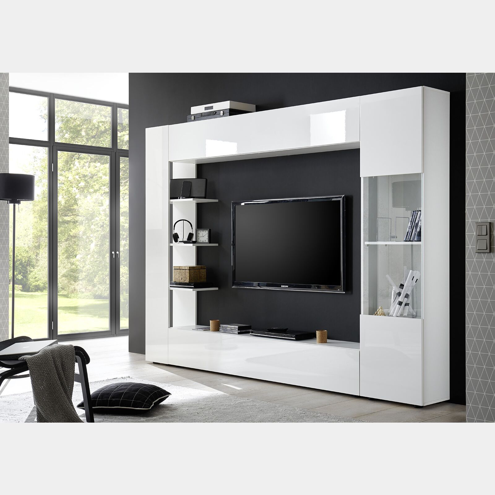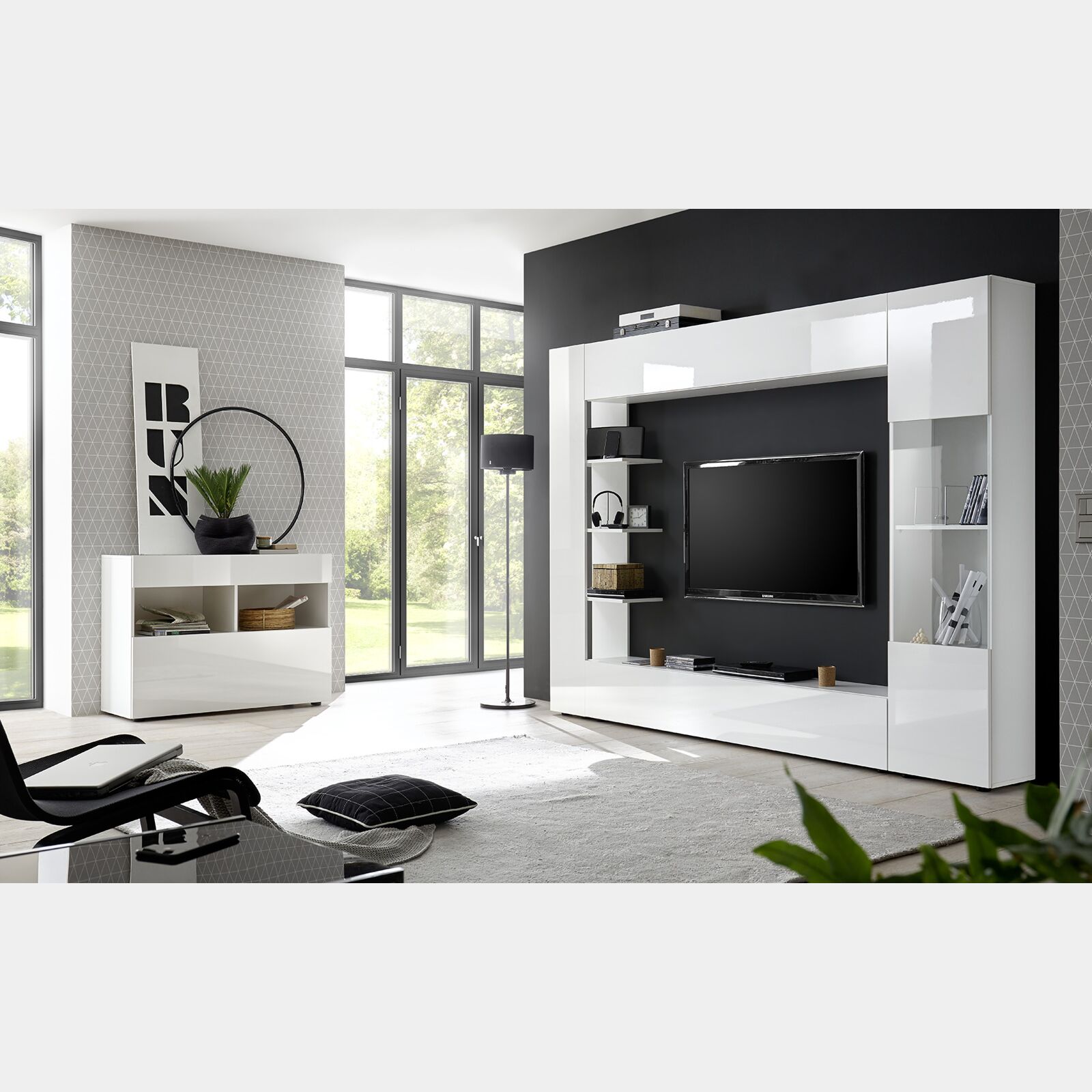 Sala moderna con parete attrezzata e madia, finitura Bianco Lucido
