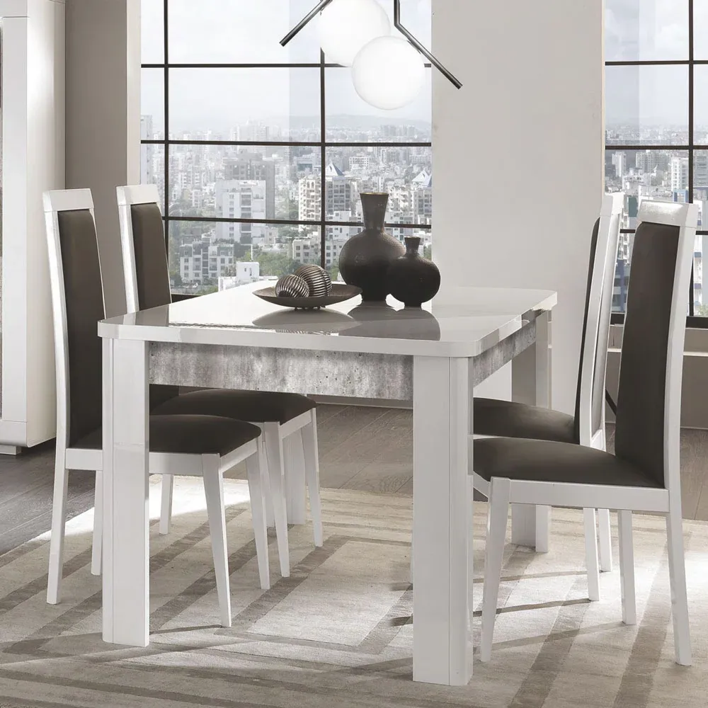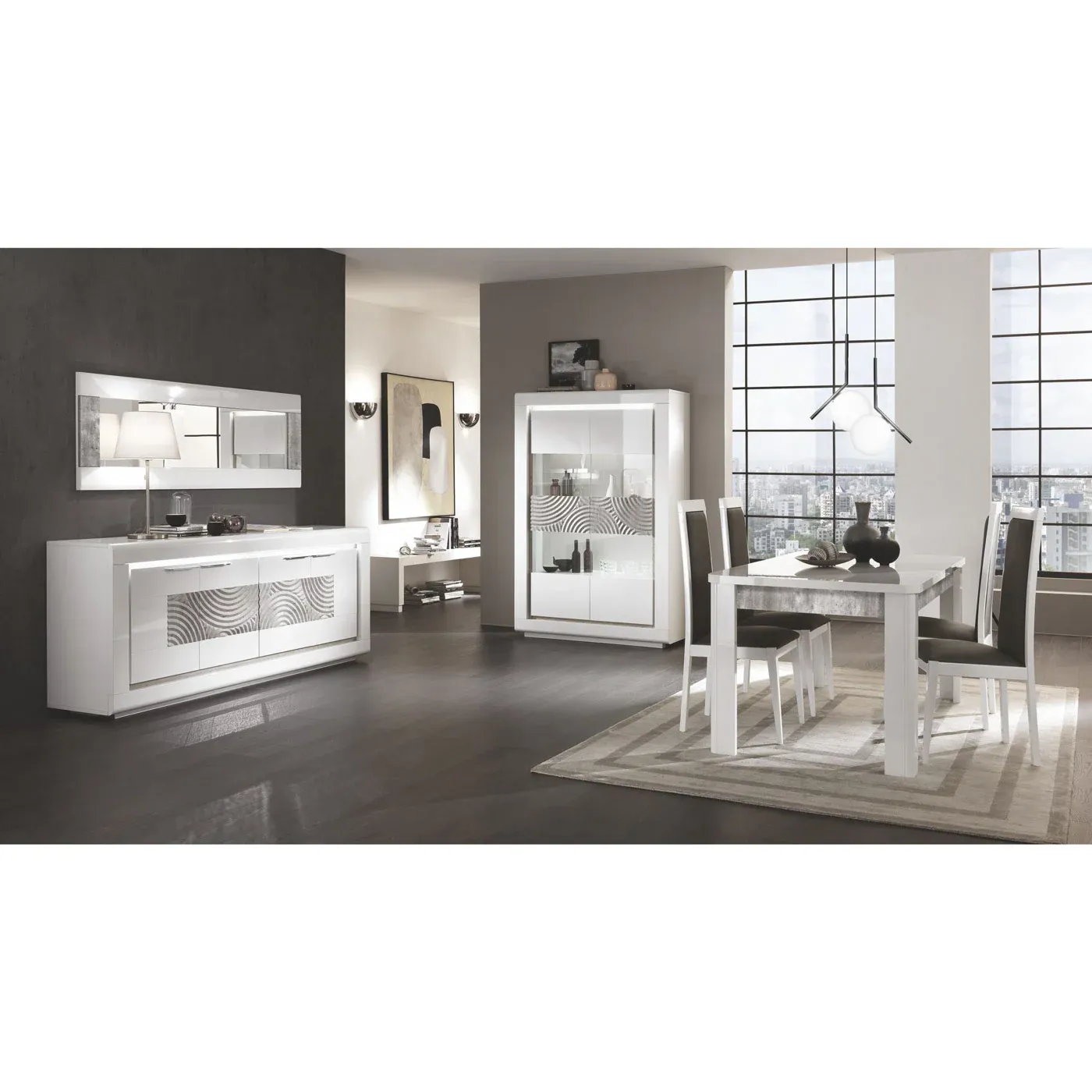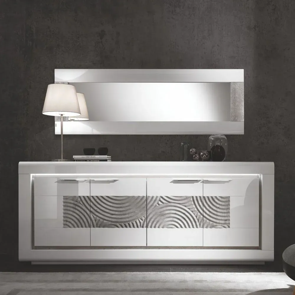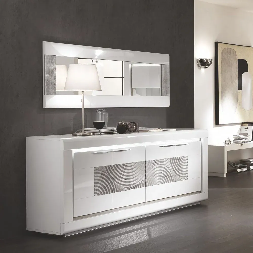 Soggiorno in finitura Bianco lucido e Cemento a basso costo formato da una madia, da una vetrina con due ante, da uno specchio e da un tavolo allungabile.