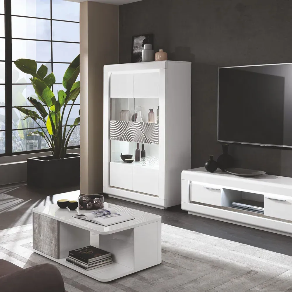 Vuoi un soggiorno a un prezzo basso ma con mobili di qualità? Ecco qui questa zona living colore Bianco lucido e Cemento. Il design moderno è in grado di rivoluzionare il tuo salotto dando un tocco di classe, di eleganza al tuo arredamento interno. La zona living è composta da: