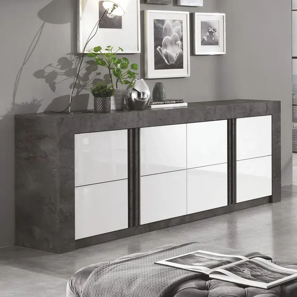 -Una madia che come si può notare nella foto è spaziosa ed è accompagnata da quattro ante. Risulta capiente per inserire al suo interno numerosi oggetti. Si può abbellire il mobile grazie a un bel soprammobile o con un vaso di fiori. La sua grafica così elegante e raffinata dona un tocco di modernità all'intera sala da pranzo.