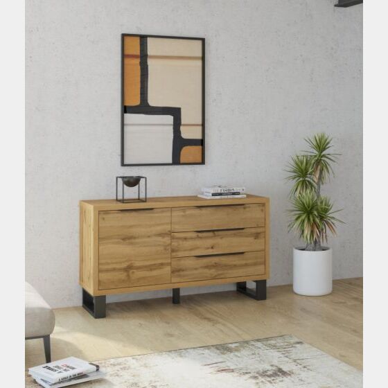 Mobile credenza multiuso dotato di 1 anta con 1 ripiano e 3 generosi cassetti. La versatilità è il suo punto di forza. Lo puoi usare come credenza, madia in soggiorno, oppure come mobile ingresso o anche come mobile multiuso in ufficio.