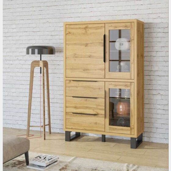 Spaziosa e capiente vetrina Cracovia 3 ante 3 cassetti colore quercia e metallo nero, la vetrina Cracovia, è la soluzione ideale per gli appassionati di salotti contemporanei con un tocco di stile industry.